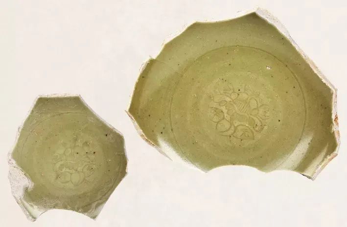 荷花纹“至元四年”碗底。这两件龙泉窑残碗内心印有“至元四年”(1388年)字样,是极具学术价值的龙泉窑纪年材料。