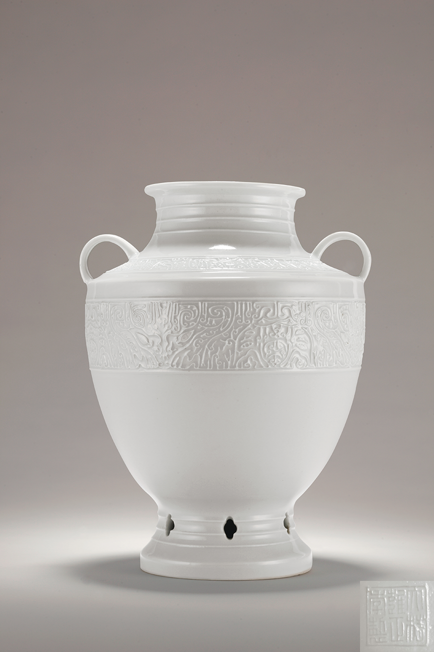 清雍正 白釉模仿仿古青铜兽面纹双耳尊