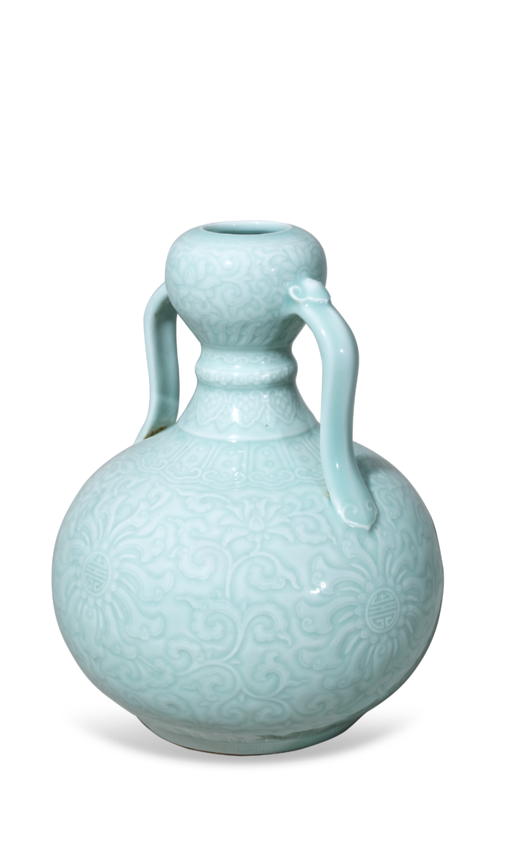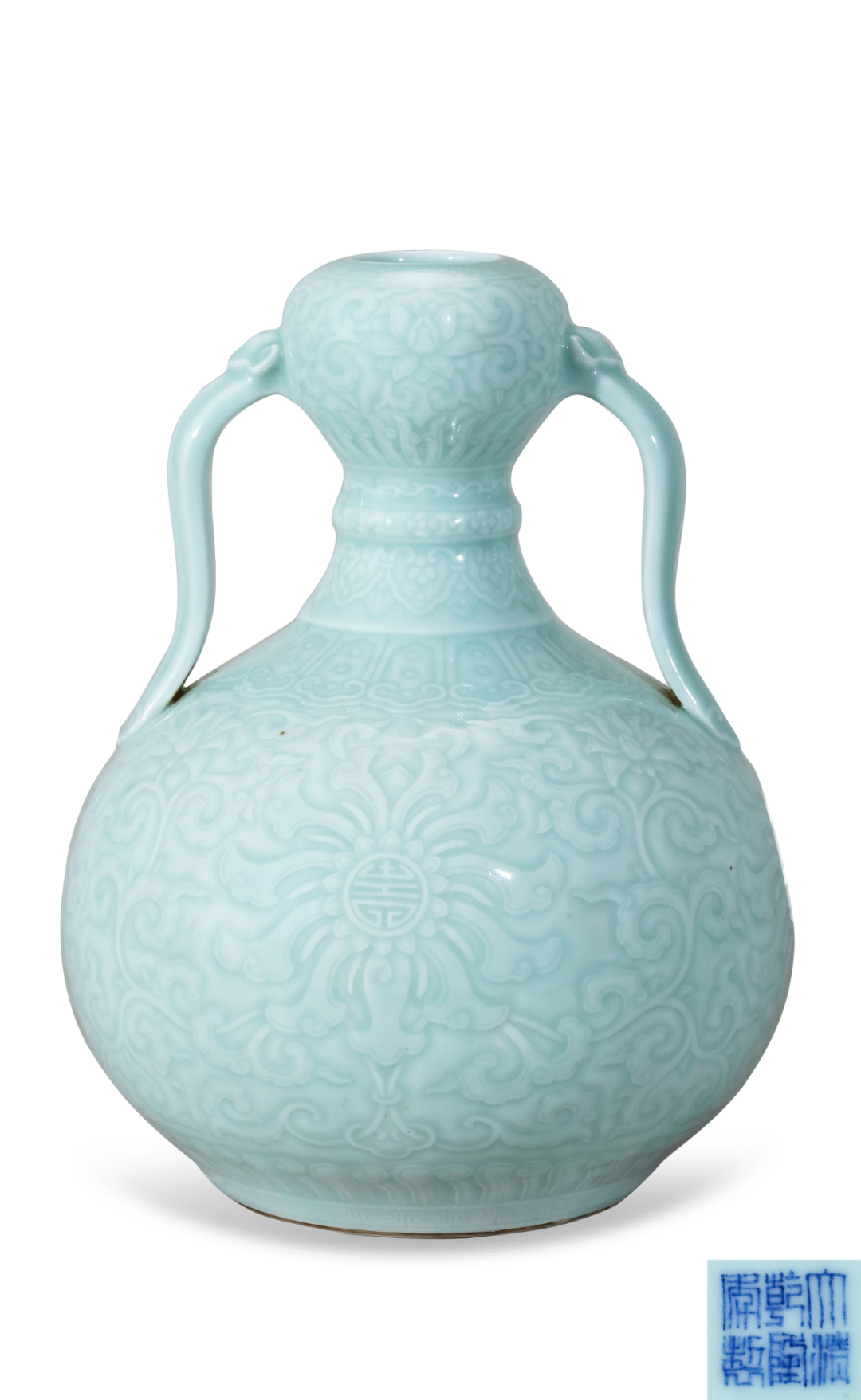 清乾隆 粉青釉刻团寿花卉纹如意耳葫芦尊