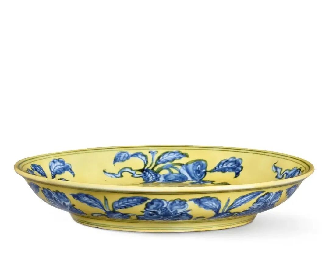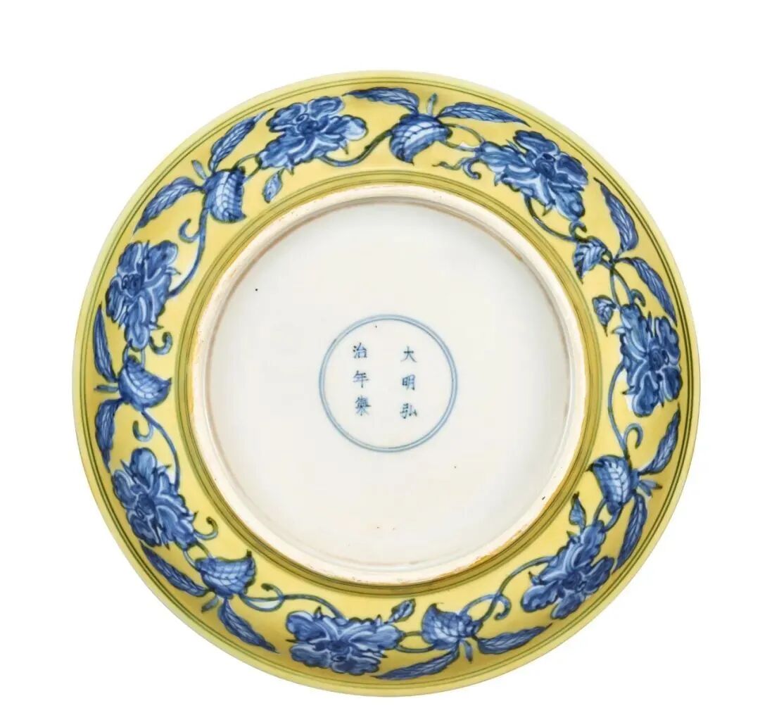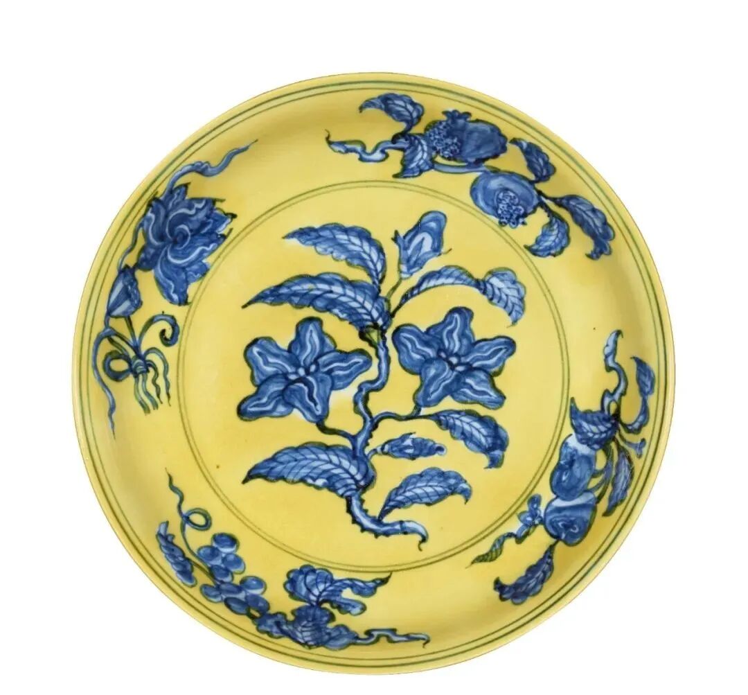 明弘治 黄地青花折枝槴子花果纹盘 《大明弘治年制》款