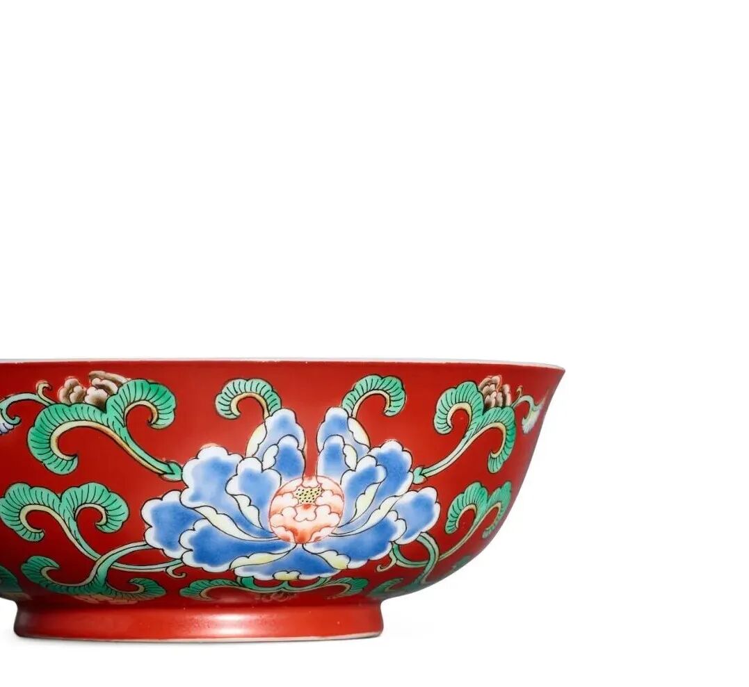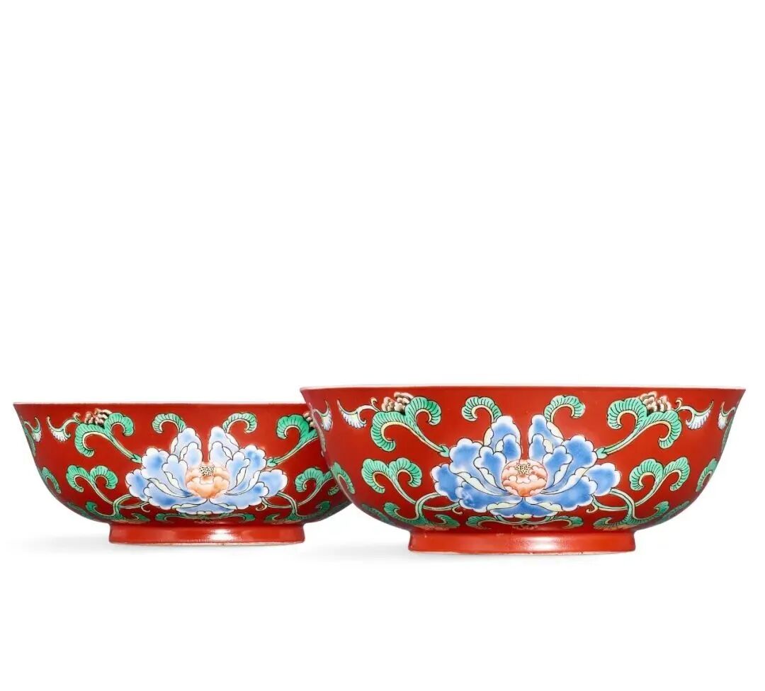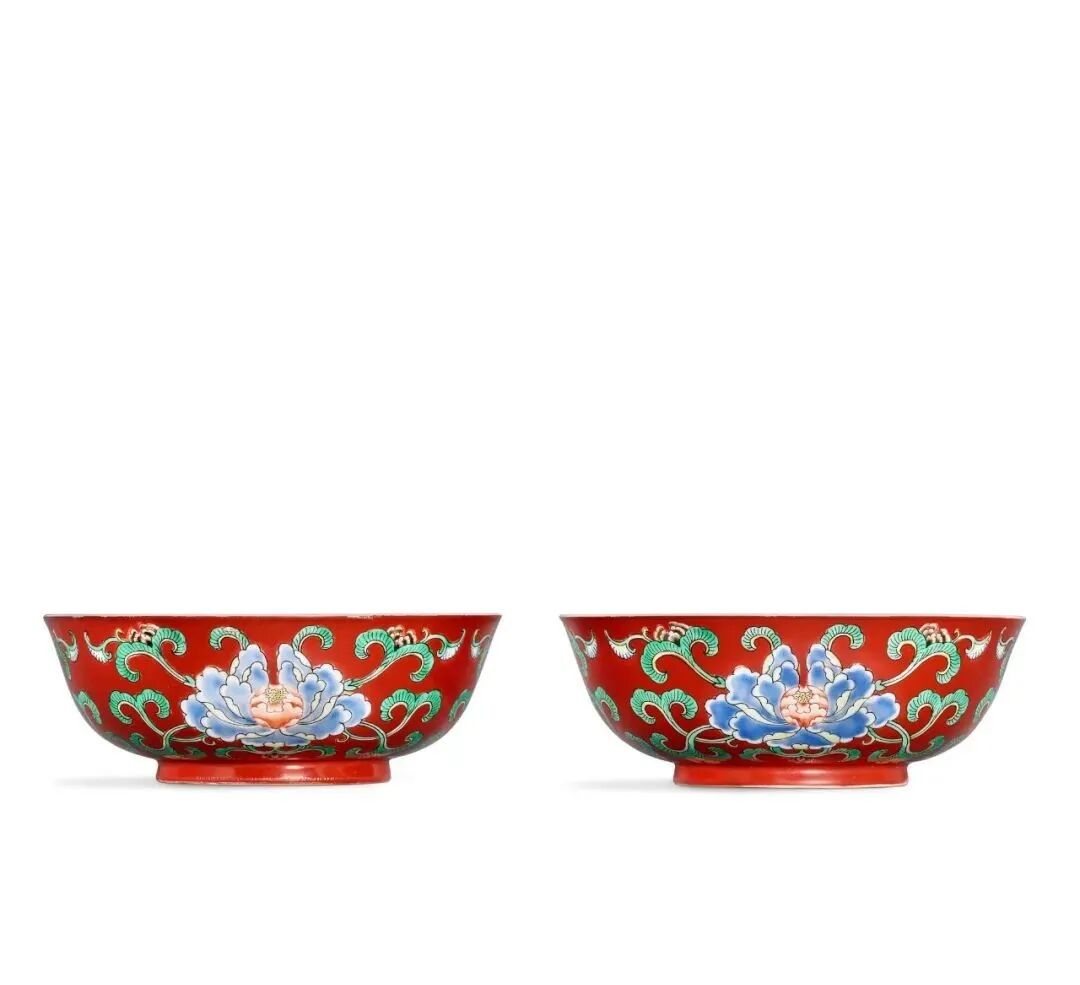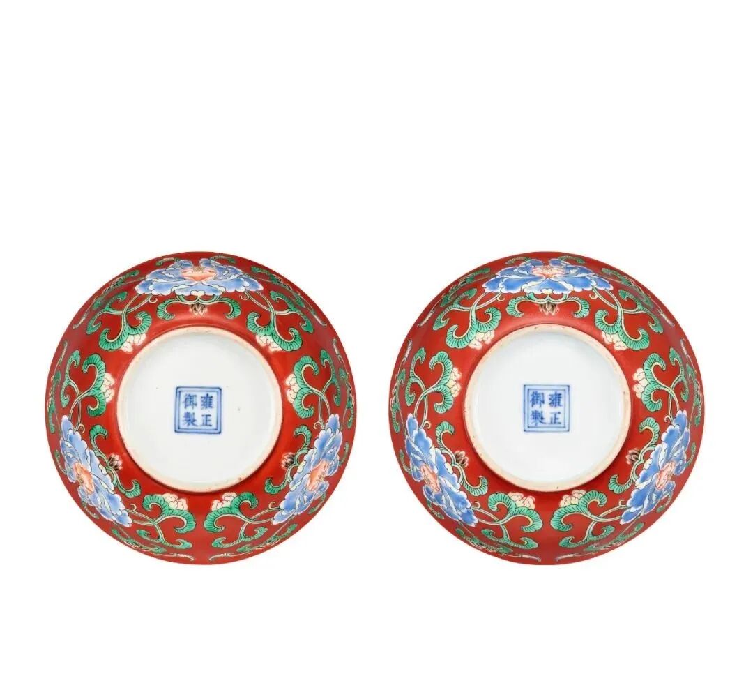 清雍正 珊瑚红地五彩折枝花卉纹浅盌一对 《雍正御制》款
