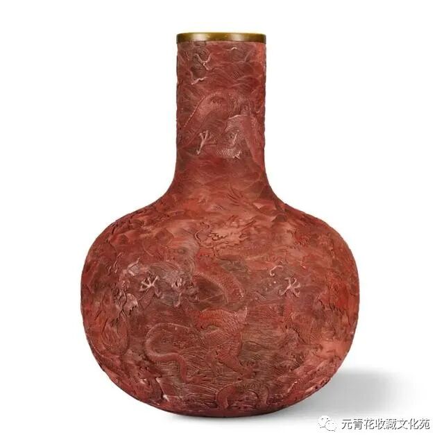 龙乃天子权力代表,而九则与久谐音,故此九龙纹饰,意寓国祚长久。相近九龙纹饰可参考数件乾隆朝作例,有青花罐、釉下青花及粉红彩梅瓶等多款,北京故宫博物院藏,图载《故宫博物院藏文物珍品全集:青花釉里红(下)》,香港,2000年,图版 118 和 230。海上红蝠纹饰,则寄愿福如东海,色彩纷呈,更添吉祥寓意。