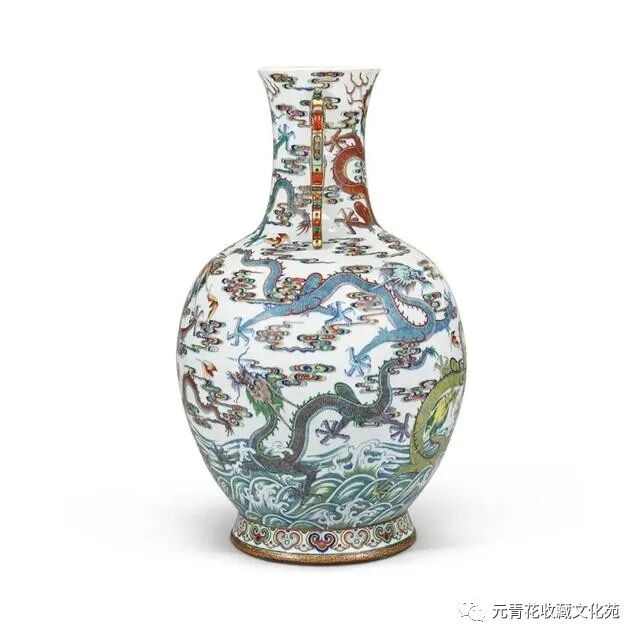 本斗彩瓶尺寸庞大,饰九龙云海,色泽夺目,极其罕见。相近纹饰之例仅只一瓶,现存于德累斯顿国家艺术收藏馆(藏品编号 PO 5981)(图 1),其纹饰与本品对称,显示两瓶应原为一对。