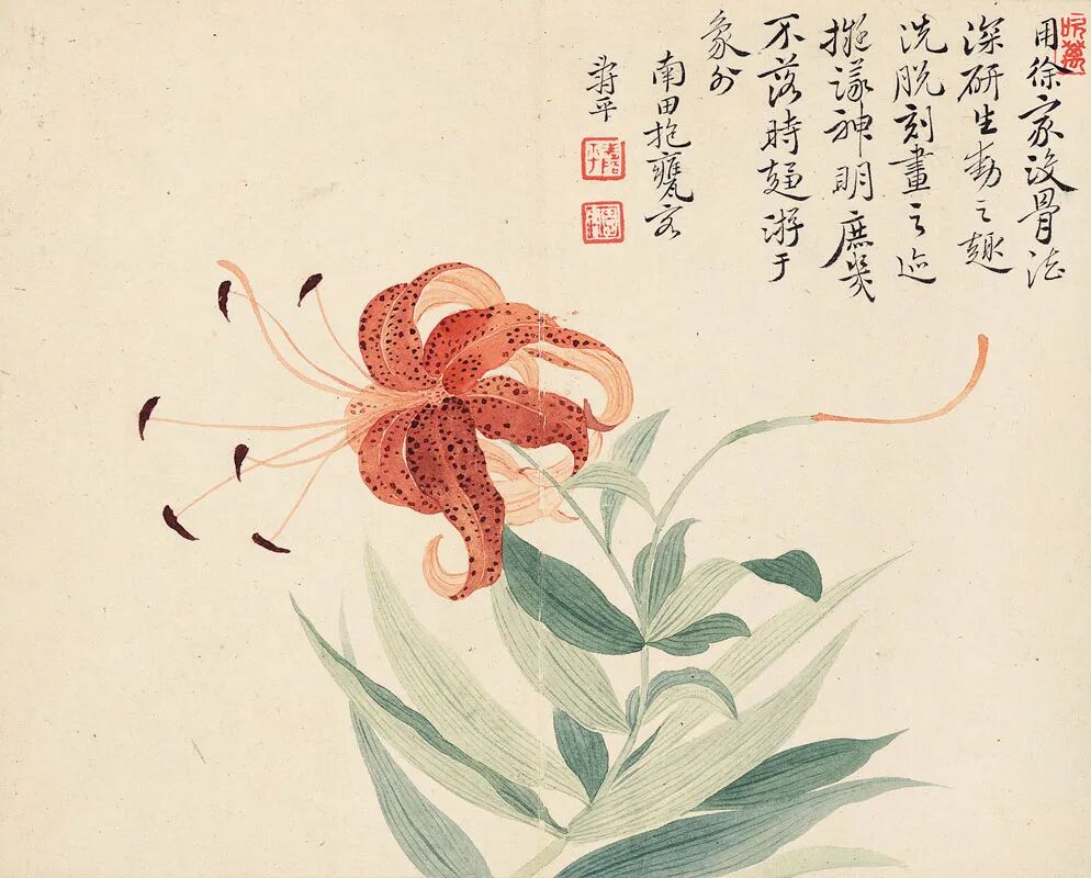 恽寿平画没骨花卉,虽然标榜追摹宋元,其实又参以写生法,文人气也不自觉地渗透其中。因此他的没骨花卉画法别具一格,设色明净,格调清丽。