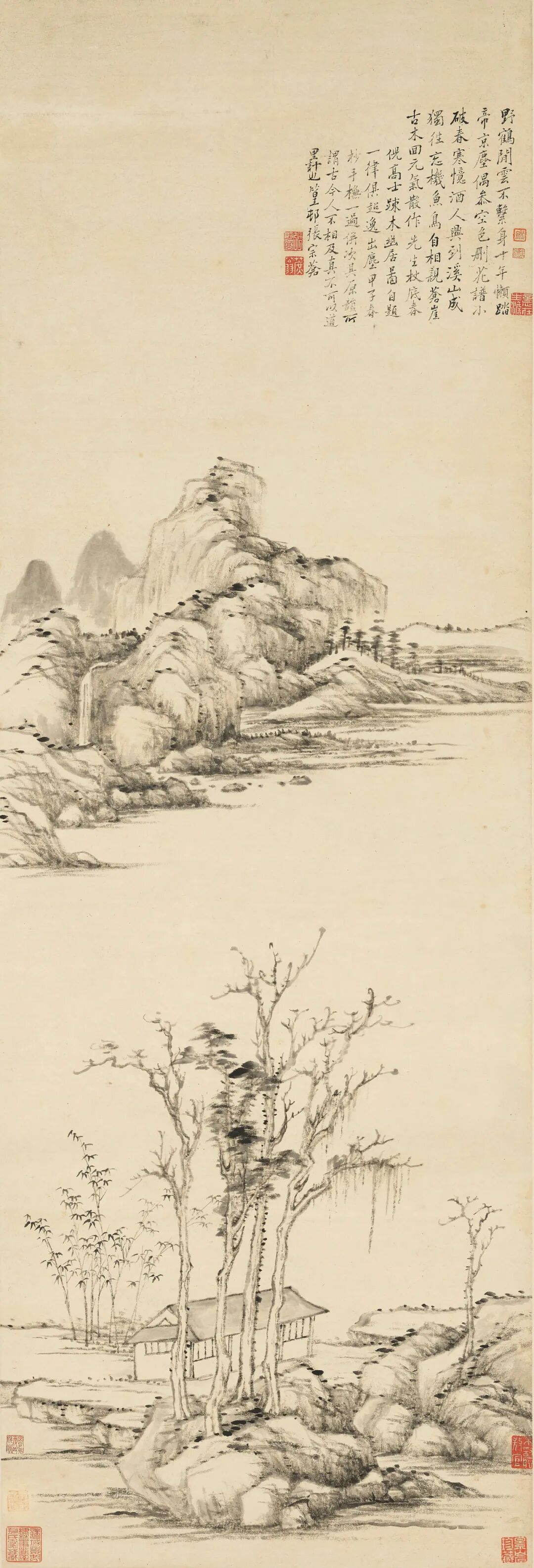 此卷《南皋图》行笔疏澹简逸,山环水抱,水岸村居,一派江南山水景像,跃然纸上。陆治末题“补图”,观台北故宫今存《明文征明陆治书画合璧卷》有 “乙未二月,门人陆治方始绘图补意” 十余字,推测《南皋图》原意当系为撰文章者补图之作,后于流传之中各自失散,遂使图文两分。画卷后陈继儒(1558-1639)行草书法内容,记山居日常所见所行所好所蓄,以物养情适性,与《南皋图》渔舟隐逸意趣略同。