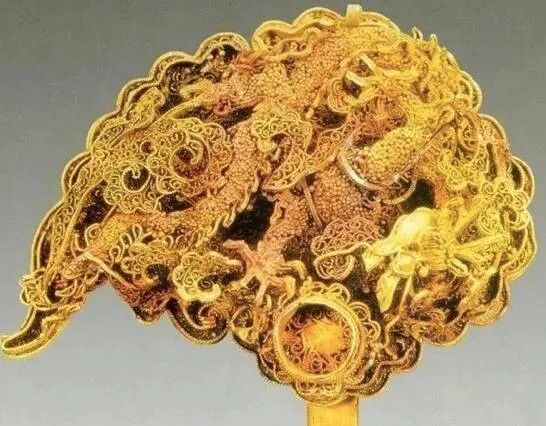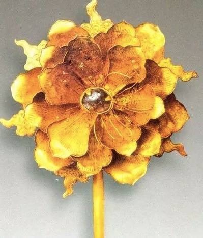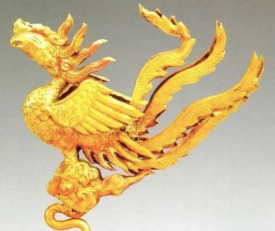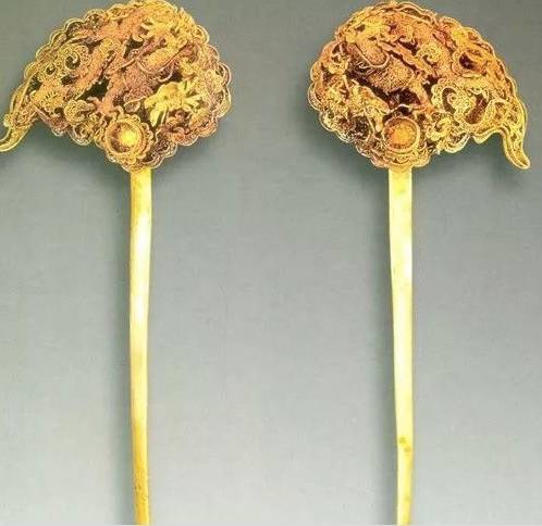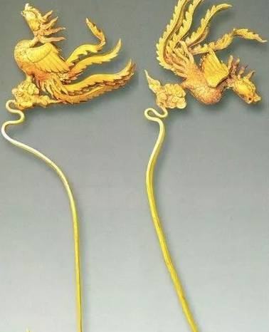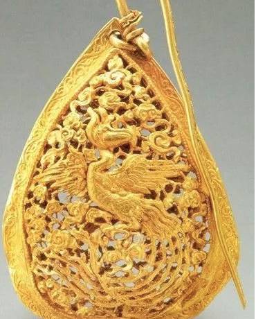 簪首为一只昂首翘尾的凤鸟,造型优美,凤鸟下为祥云,祥云上为卷云纹,下焊接扁条簪脚。簪首焊接金花,花朵为一朵盛开的牡丹花造型。花瓣共分为六层。簪体为花枝,顶端托六角形花蒂,下面的六片花叶呈翔云状。花朵中部的花蕊镶嵌蓝宝石。金黄色和宝蓝色相映成辉,华贵大气。簪首用细金丝做出祥云状,上为一条蜿蜒飞舞的五爪金龙,龙首翘起,头向朝着一个镶嵌宝石的托窝,宝石出土时已脱落。出土的一对金耳环造型为“S”型,顶端连接有细金丝,用金丝串连有绿松石饰件和两颗珍珠。此对手镯为扁体圆形,镯身素面,仅镯首两端雕刻成两龙首相向状。金霞帔坠为水滴形,上有金钩,钩内搭配细长形钩针,霞帔坠中间以祥云为底,正反面均镂雕凤凰飞舞图案。皮弁