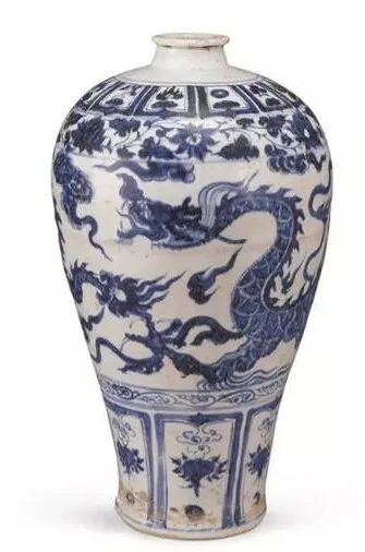 这些瓷器中最为瞩目的莫过于两件元青花梅瓶:1件元青花龙纹梅瓶、1件元青花四爱图梅瓶。