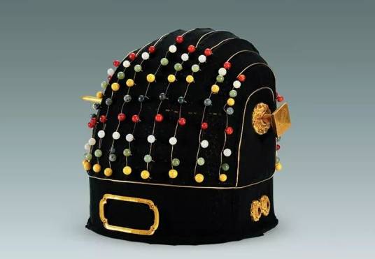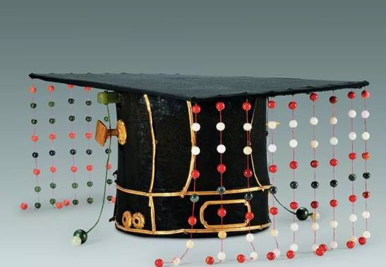 冕冠和冠卷已朽,尚存140件金玉附件,计有:贯冕金簪1件、金冠箍1件、金花纽6件、金方环2件、碧玉珩1件、冕珠125颗、碧玉瑱2件、白玉瑱2件。