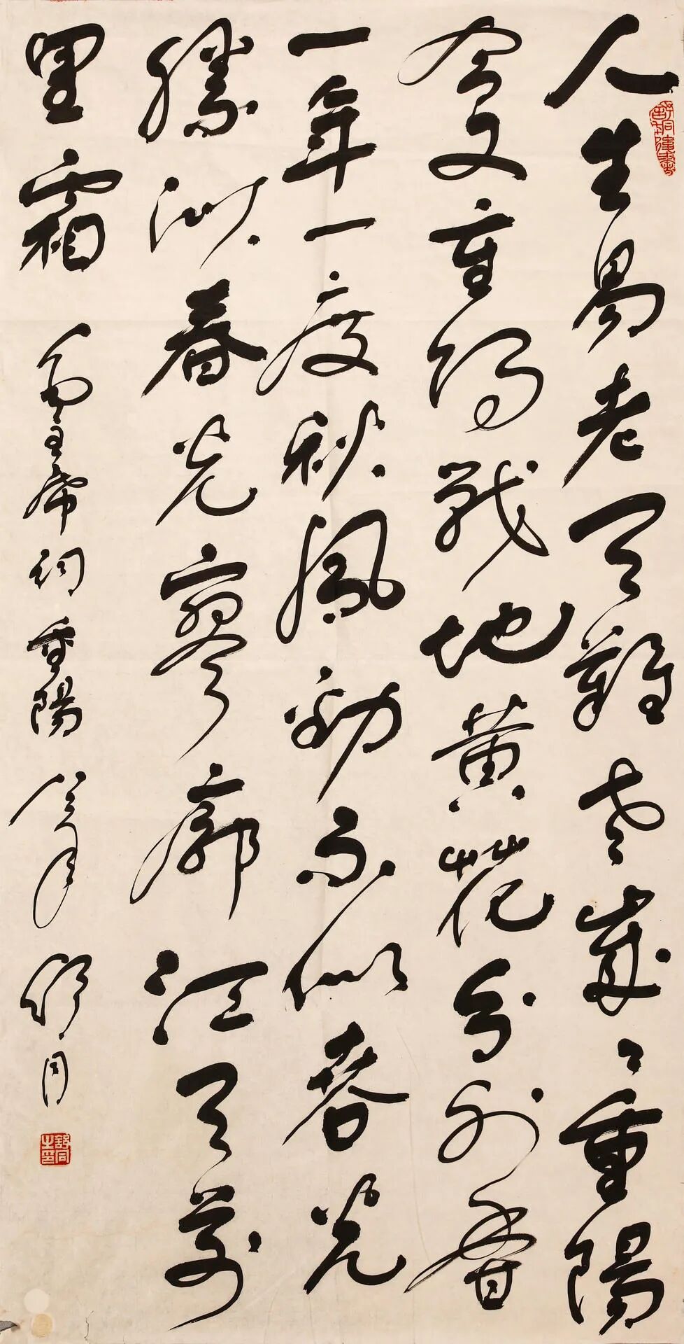 释文:人生易老天难老,岁岁重阳。今又重阳,战地黄花分外香。一年一度秋风劲,不似春光。胜似春光,寥廓江天万里霜。