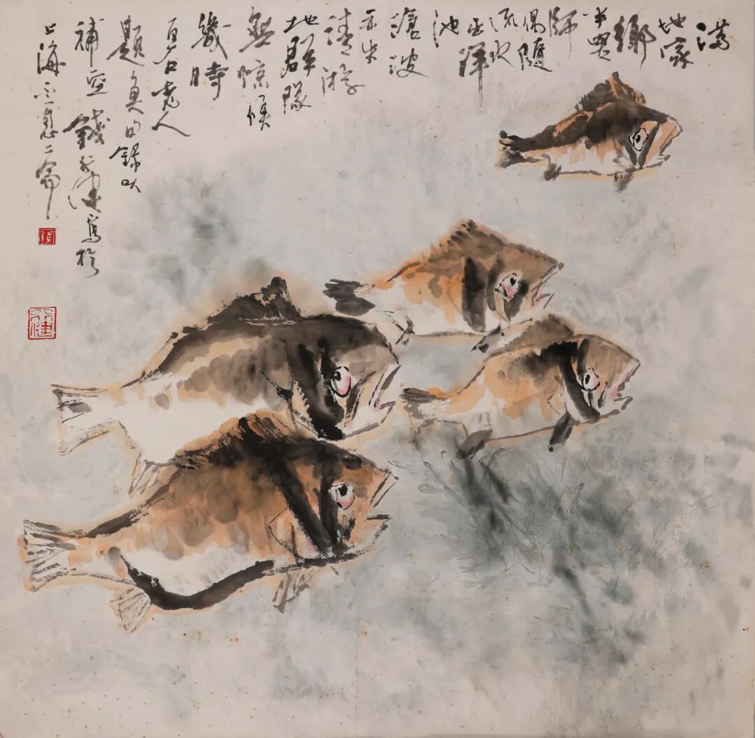 题识:满地家乡半罟师,偶随流水出浑池。沧波亦失清游地,群对无惊候几时。白石老人题鱼句,录以补空。钱行健上海不息斋。