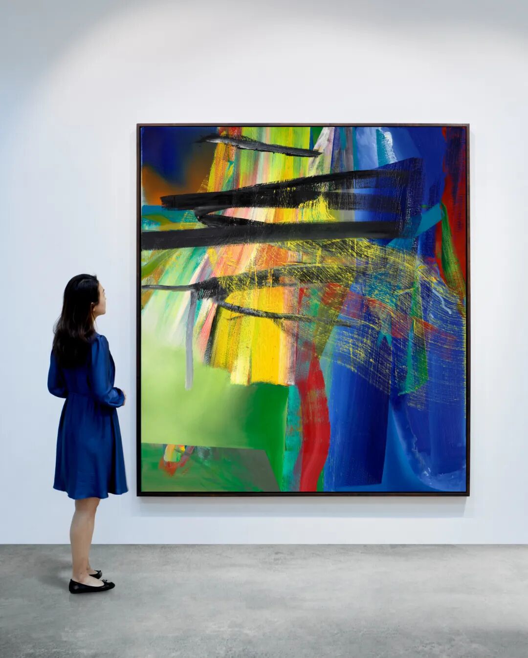 杰哈德李希特(1932年生)《Besen》即将亮相5月26日香港二十及二十一世纪艺术晚间拍卖在此幅画作中,金黄、宝蓝、鲜红、粉彩与橘红如色彩瀑布般由画布顶端倾泻而下,好像来自于天堂之上。为了平衡着至上而下的强大力量,墨黑的线条如丝带般缠绕住瀑布,给予了画面更强的空间感和色彩搏斗的张力。然而,更加有趣的是,这些个性鲜明的色彩在画面左上和谐的融为一体,化为柔软的光晕,平衡了画面右边力量之感,化成一支刚柔并济的色彩的交响乐,欣赏之中,色彩充满律动感与相互交错的空间感,展示了艺术家对于笔触和颜色登峰造极的控制力。用笔刷作画,你拥有绝对的控制。笔刷沾取颜料,再将其展现在画布。你完全可以凭借经验预知下一步。而刮刀会让你失去控制。不是全部,而是一部分控制。它完全取决于当下选择的角度、压力以及特定的颜料种类。