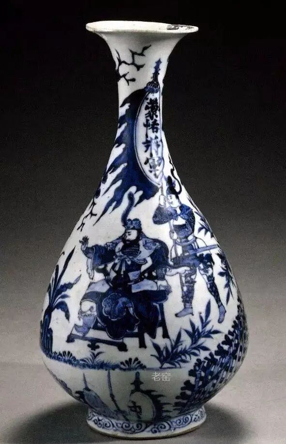 三顾茅庐是汉末时期,刘备三次拜访诸葛亮出山相助的故事,在“三顾茅庐罐”上诸葛孔明头系软巾、身穿长袍,盘膝坐在苍松之下,书童双手捧书箧站立一旁,左前方一双髻童子正倾身禀告。画面的另一侧,有一枝繁叶茂的垂柳。树下刘备戴交脚幞头,着长袍,躬身拜谒。关羽和张飞在一边窃窃私语,画中把诸葛亮的高逸潇洒、刘备的求才若渴,以及关、张二人焦急烦躁的神情体现得淋漓尽致,展现了元代高超的绘画技艺。