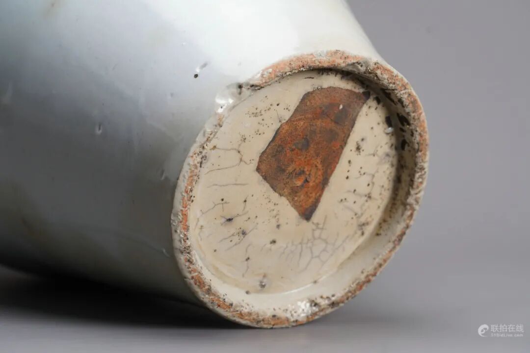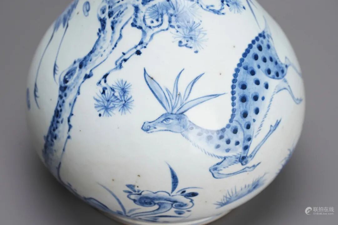 题材取鹤鹿同春之意,此吉语取中国民间运用谐音的手法,以“鹿”取“陆”之音;“鹤”取“合”之音。“春”的寓意则取花卉、松树、椿树等。这些形象,组合起来构成“六合同春”吉祥图案。俗信以鹤为仙禽,鹿为瑞兽。鹿的异禀,《述异记》上有个讲法,说是这种动物活到一千岁,通体皆呈苍色,再过五百年变白色,活到两千年时又是变为黑色。《瑞应图》上则称,如果帝王为政,适合先圣的法度,没有缺失,便会有白鹿出现,是国泰民安、政通人和的吉祥之兆。因此《鹤鹿同春》图表达了人们企求国泰民安的良好愿望,故常常作为瓷器上的绘画题材来使用。此花瓶为玉壶春瓶造型,瓶身釉水莹润,青花画风写意,得八大山人之趣,底足有一条冲线。