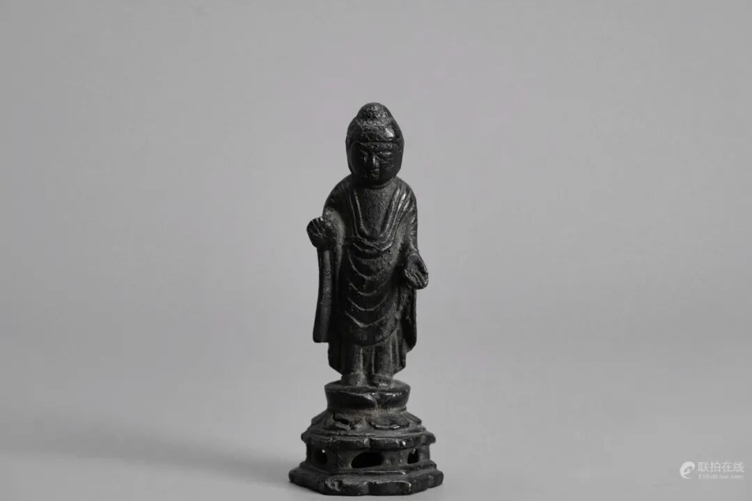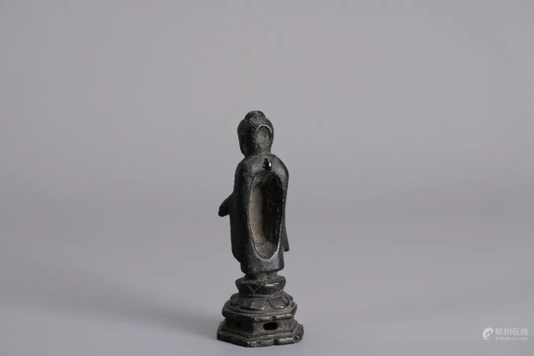 开相类似唐代佛像,面部丰腴圆融,神态安详宁静,立于金刚台座之上,一手施无畏印,一手施与愿印,衣纹流畅,似乎仍保留有健陀罗特征,整体包浆古朴自然,呈青铜氧化后的黑漆古色。背部似曾有装藏,与背光俱已轶,仍不失为一件精品金铜佛像。