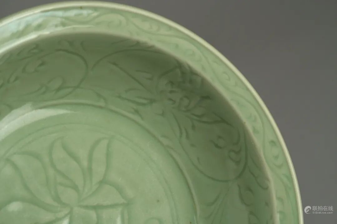 元代龙泉窑瓷器与宋代风格迥异。一般来说器型高大、胎体厚重;胎色为白中带灰或淡黄;釉色为粉青带黄绿,光泽较强,釉层半透明;装饰手法多种多样,有刻、划、印、贴、塑等,以划花为主,花纹粗略,线条奔放,纹饰以云龙、飞凰、双鱼、八仙、八卦、牡丹、荷叶等为多见。此件龙泉窑洗用半刀泥工艺刻卷草纹,里心为牡丹纹,造型舒展,刀法流畅,极具意蕴。底部露胎,微有火石红色,仍带南宋风韵,为日本藏家所钟爱品种。