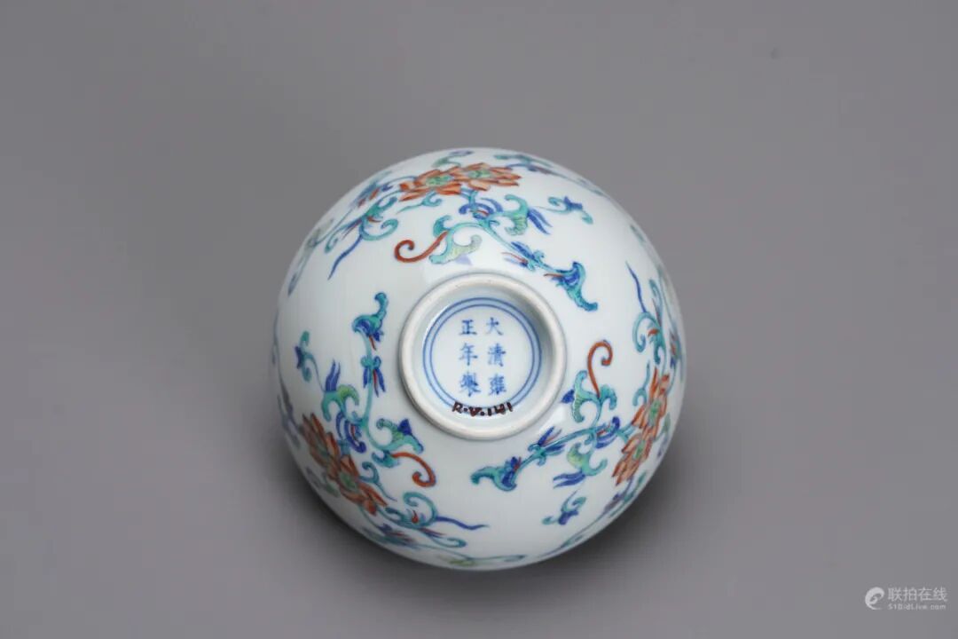 在清三代瓷器中,雍正瓷器烧造时间最短,却有众多拥趸,原因在于其承前启后的风格正好达到了中国传统中和审美的感觉。相比于康熙瓷器的质朴与乾隆瓷器的繁复,雍正瓷器有着独特的疏朗散淡之美。此件缠枝纹间的几组团之间留白较多,以并蒂莲为中心向周围发散。并蒂莲是荷花中的一个变种,实际上,它一茎产生两花,花各有蒂,蒂在花茎上连在一起,所以也有人称它为并头莲,同心芙蓉,合欢莲,瑞莲。元乔吉《金钱记》第二折:“我本是个花一攒锦一簇芙蓉亭,有情有意双飞燕,却做了山一带水一派竹林寺无影无形的并蒂莲。”