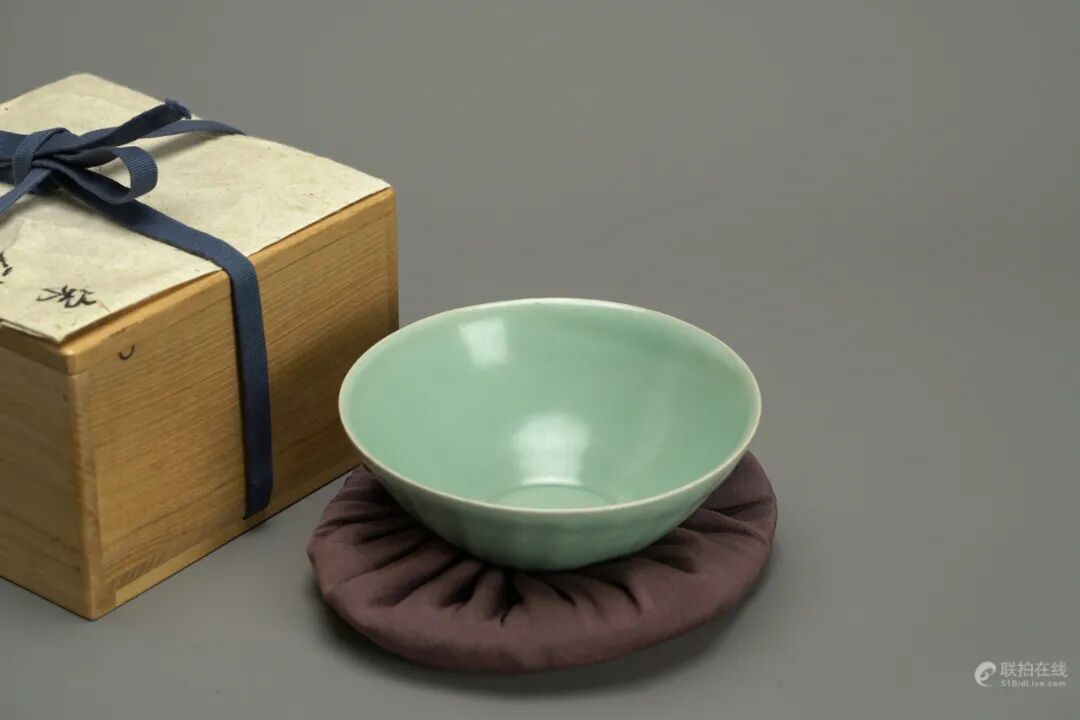 砧青瓷即龙泉青瓷,江户时代日本把高档的龙泉青瓷称为“砧青瓷”。砧是用来把布变柔软的木制工具,其形状很像一类龙泉窑青瓷瓶,因而产生了“砧青瓷”的叫法。还有一种说法是,在茶道上大有成就的千利休所拥有的一件青瓷花瓶出现了裂纹,「裂纹」(ひびHibi)一词和砧木敲击时发出的响声(響きHibiki)在日语中的发音几乎是一致的,因而由这种谐音诞生出了「砧青瓷」的叫法。十世纪后半期到十五世纪,传入日本的中国陶瓷仍以龙泉窑青瓷为主,在日本产生了极大影响,至今多有传世,这件小盏应为当时的贸易品,在日本户家中代代相传,收藏至今。