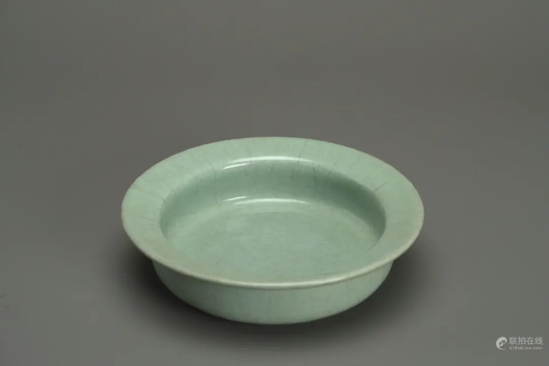 此洗为支钉烧制而成,釉色莹润华美又兼含蓄内敛,不难让人联想到著名的“玉津园”纸槌瓶。其造型简洁古雅,比例精妙,深具庙堂气息,与二十世纪的包豪斯极简主义审美不谋而合。