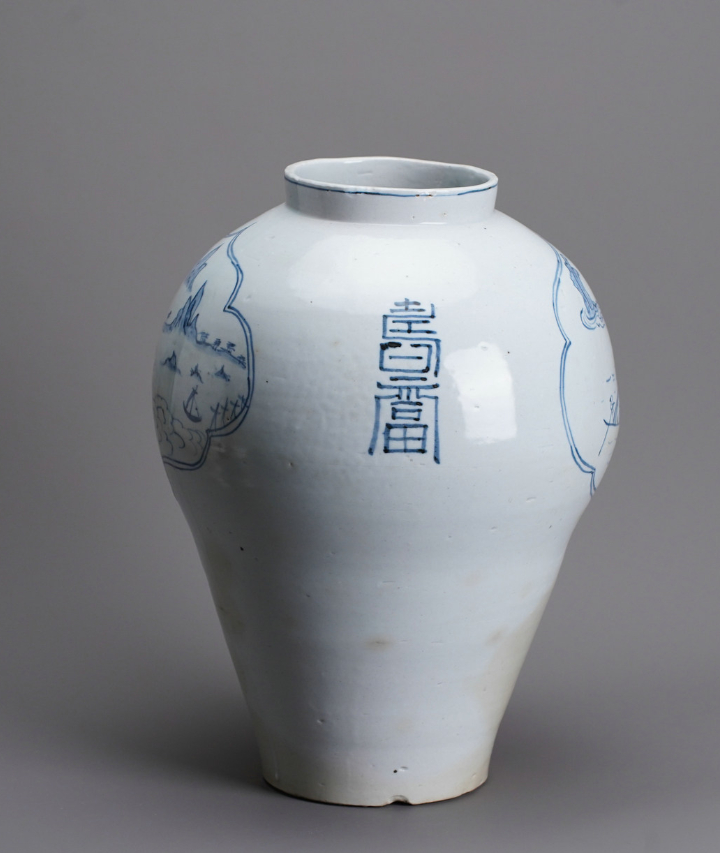 李朝瓷器的烧制,大概相当于中国的明代,是在继承高丽白瓷的生产工艺等基础上发展起来的,李朝白瓷青花的出现不会晚于15世纪中期世祖时,宣德三年大明使节尹风将青花瓷承献世宗后,青花瓷即成为李朝御用之器,禁庶人使用。《经国大典》(1461年)载:世祖时,帝王酒器用金银和青花、白瓷器,庶人禁用。据成侃(1439~1504年)《慵斋丛话》曰:“世宗朝御器专用白瓷,至世祖朝杂用彩瓷,求回回青于中国,画樽、杯、觴,与中国无异”。此件造型近似梅瓶,两面有开窗,中间为青花绘制的山水纹样,用笔飘逸,意境悠远,盖为同类产品中的佳作。
