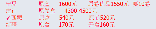 因此在量少为王的收藏市场里,老新疆的行情并不如宁夏和西藏,原盒预计170元/枚,开盒160元/枚。