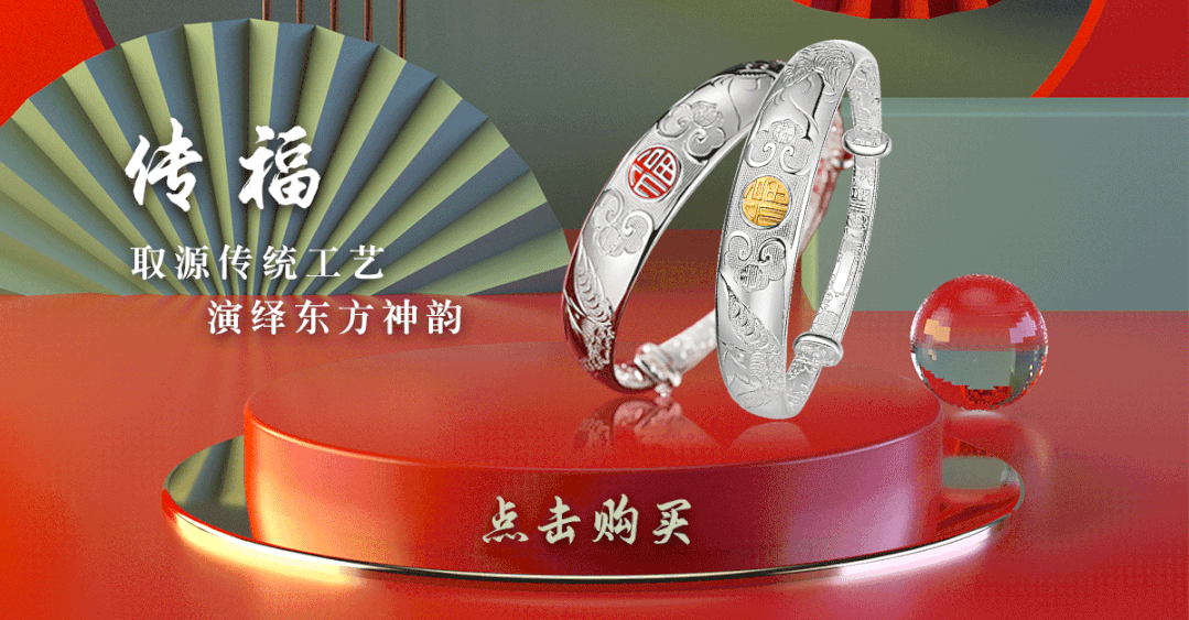 “镶金传福”手镯采用30克999足银打造,镯面雕刻龙凤纹、福寿纹、百福纹等吉祥纹理,采用错金银创新工艺,镶嵌999足金金片,精工细致,非常漂亮!