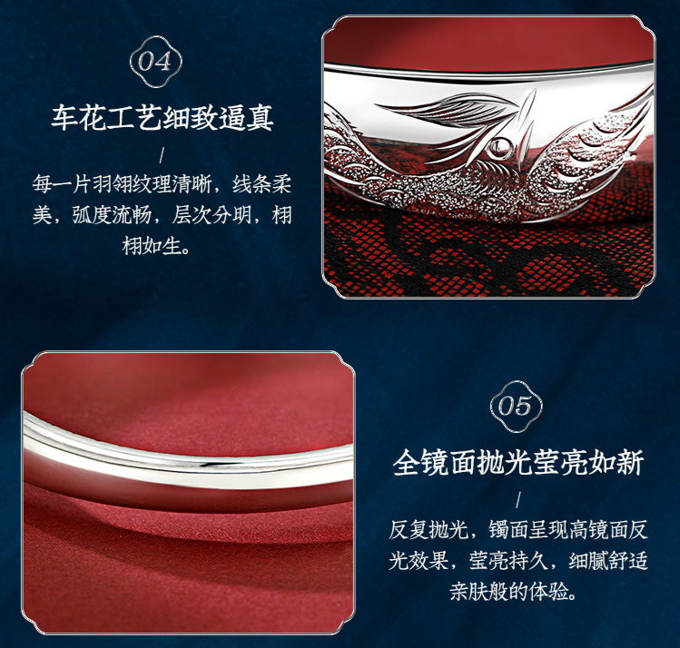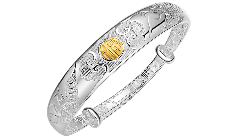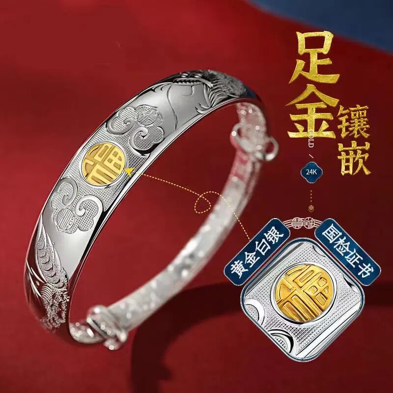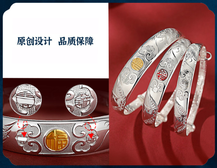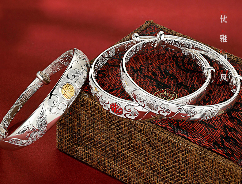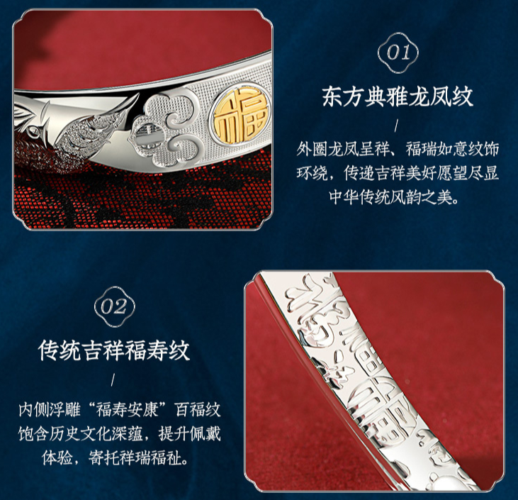 手镯采用999纯银打造,镯面雕刻龙凤纹、福寿纹、百福纹等吉祥纹理,采用金银错创新工艺,镶嵌999足金金片,精工细作,非常漂亮!