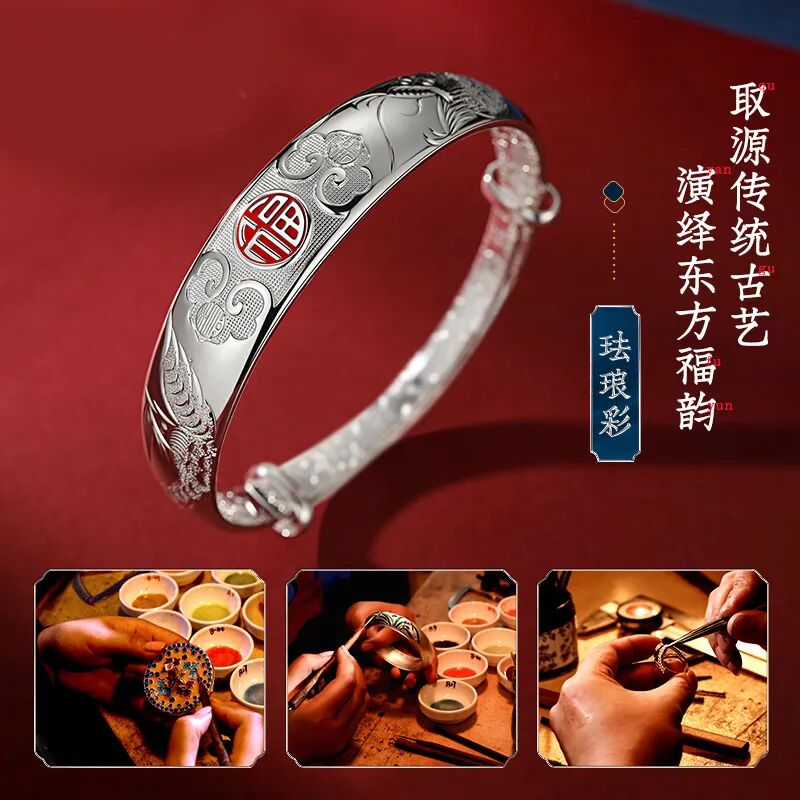 “红福传福”手镯采用20克999足银打造,采用宫廷技艺流传而来的珐琅彩工艺,低温烘烤而成,色彩艳丽自然,气质更加内敛!
