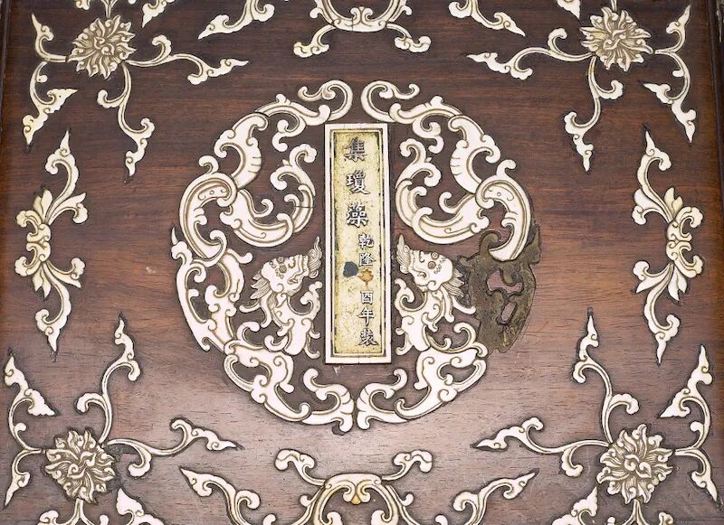 为了收藏与搬运方便,特别制作造型统一的外盒,以珍贵的紫檀木镶嵌象牙花案而成,并在盒盖上刻出名字,这里展出的叫做“集琼藻”,打开藏宝箱,就像进入一个寻宝游戏中。