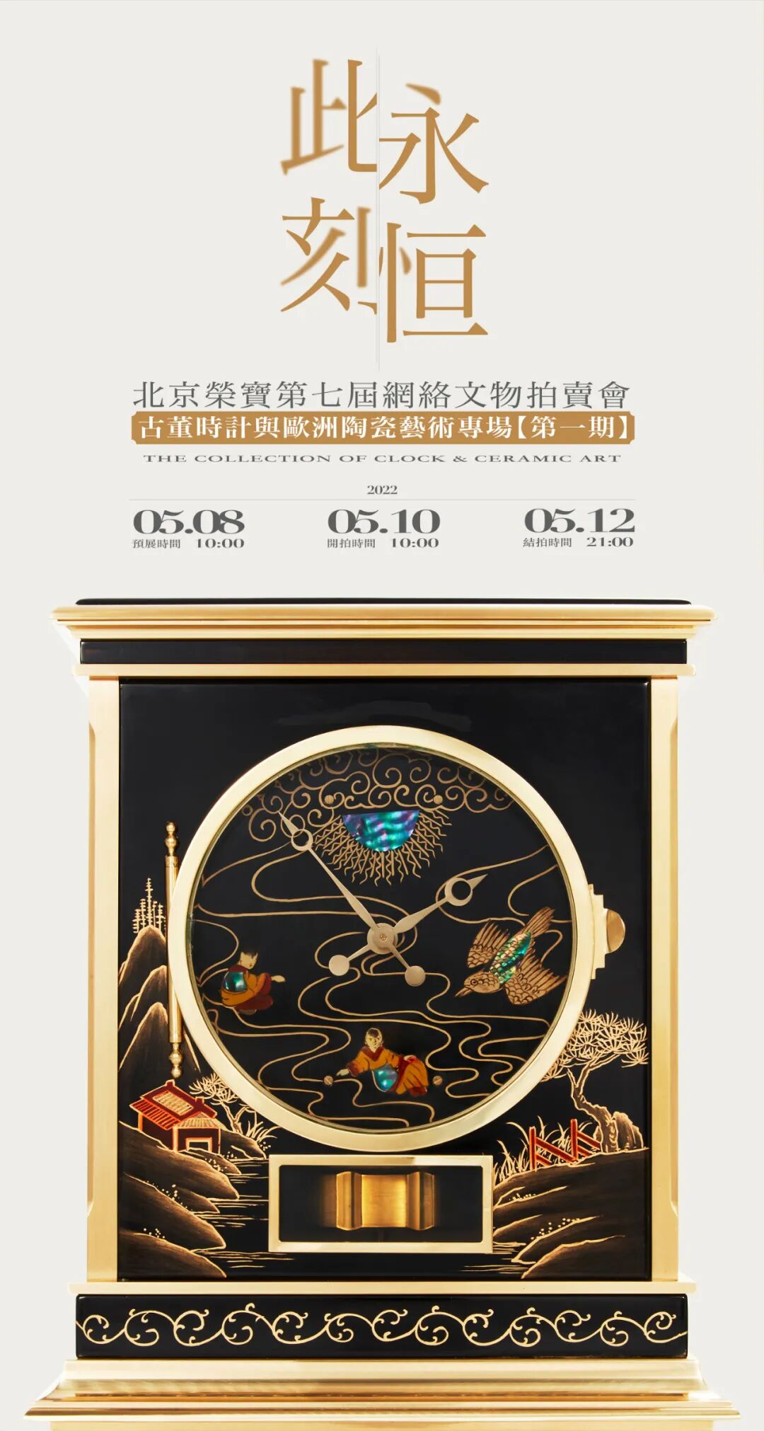 北京荣宝第七届网络文物拍卖会——此刻永恒·古董时计与欧洲陶瓷艺术专场(第一期)将于5月8日10:00—5月10日10:00开启线上预展,并于5月10日10:00开拍,5月12日21:00结拍。