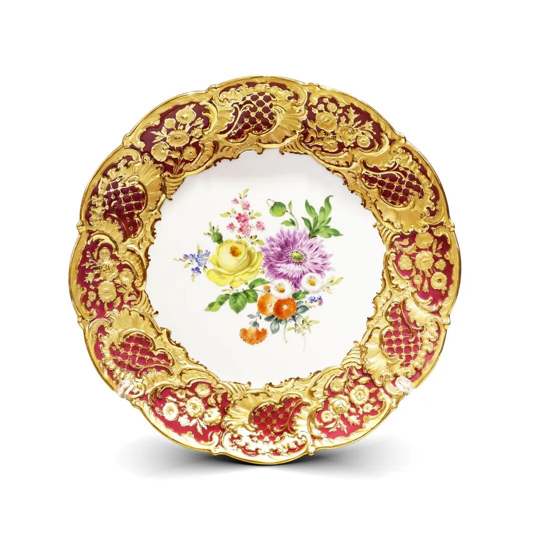 德国 梅森Meissen 玫红色重鎏金手绘花卉装饰盘