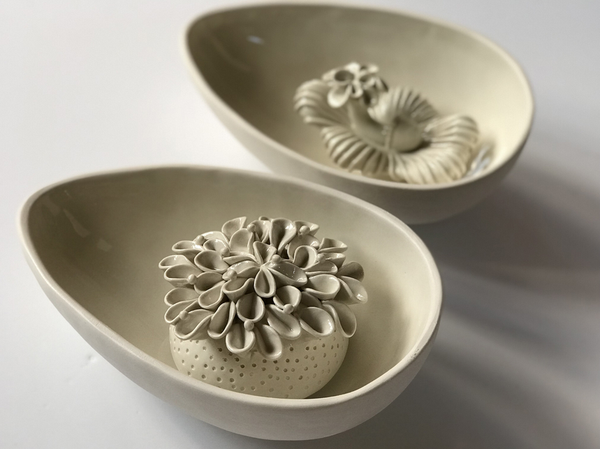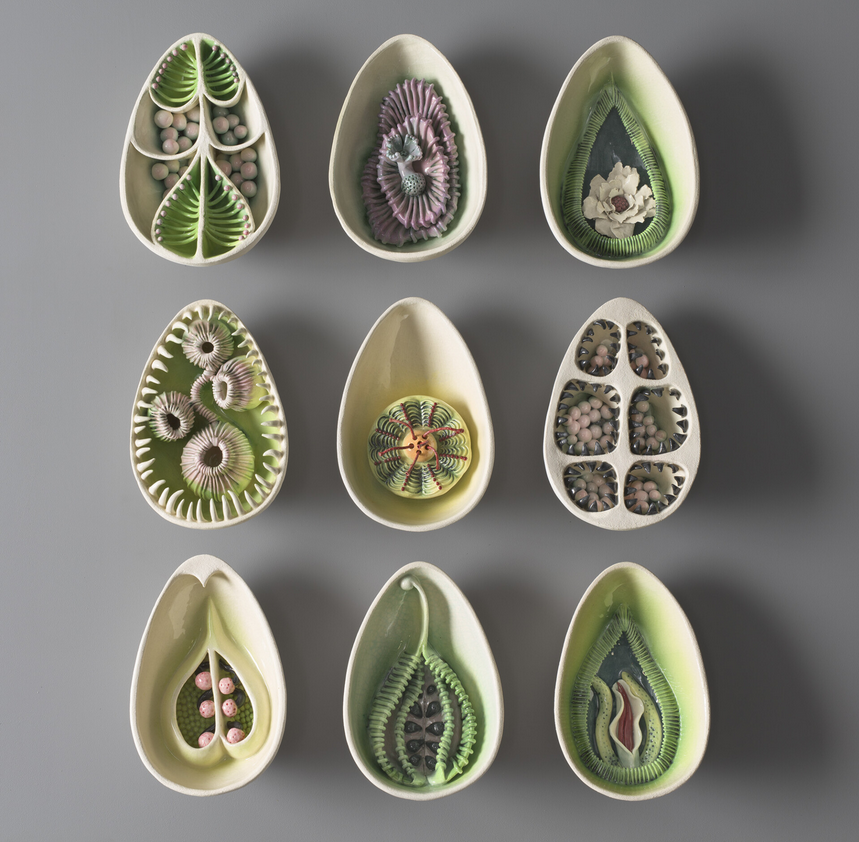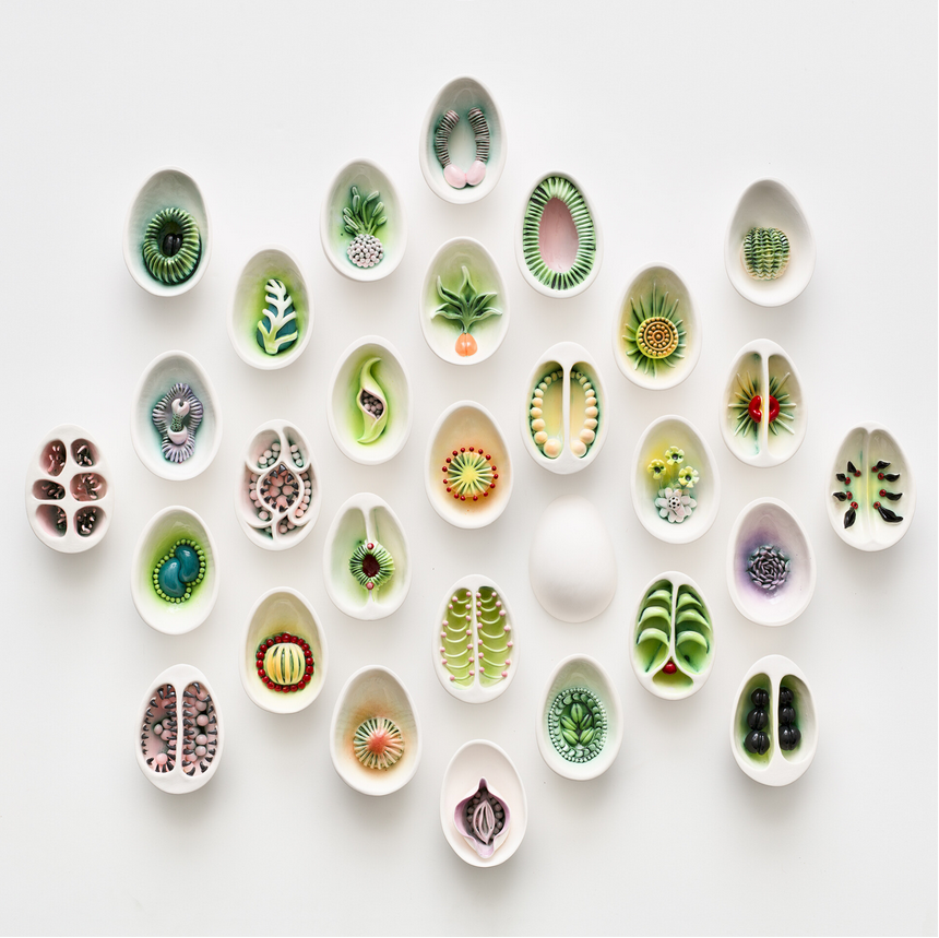 墨尔本艺术家萨莉·肯特(Sally Kent)在她易碎的瓷荚中,想象自然界中转瞬即逝的过程。这些陶艺作品以横切的方式展示了内部的种子、花朵或其他多产的生物体,将充满色彩和纹理的内部生命形式与它们坚硬光滑的外壳进行了比较。