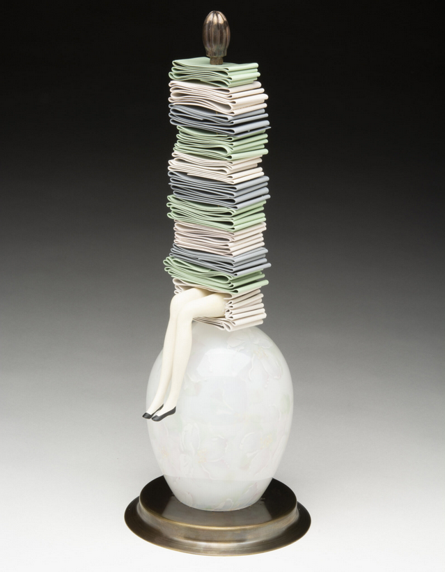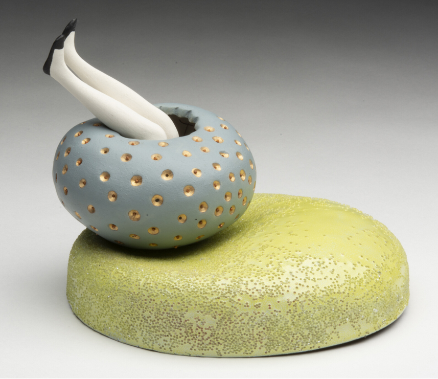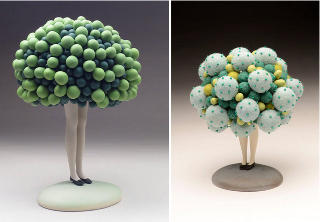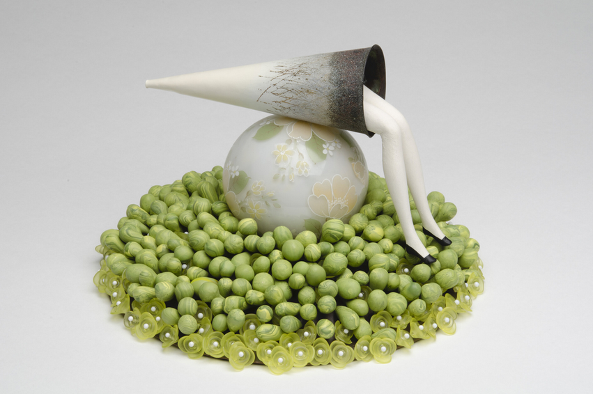 印第安纳州艺术家杰西卡·卡尔德伍德(Jessica Calderwood)在她古怪的伪装人物身上植入了关于女性心理的问题。无论是被一个圆点圆球覆盖,还是被困在一个皱褶的织物筒中,她的不伦不类的女性都暂时被环境所束缚,她们唯一的特征是光滑的黑色高跟鞋或从伪装中脱颖而出的条纹膝袜。卡尔德伍德说,这种隐瞒是“一种否定,一种对隐藏在下面的东西的审查或否认”。这些拟人化的人同时是强大和无力、美丽和荒谬、膨胀和被截肢的。”
