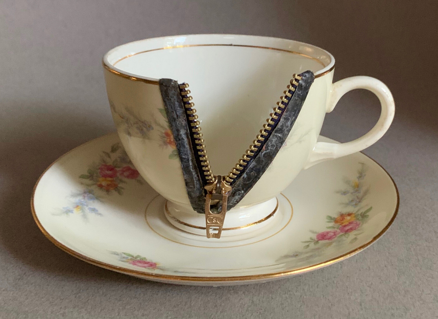 俄亥俄州艺术家格伦·泰勒(Glen Taylor)用粗糙的金属片和焊接来修补陶瓷餐具,与光滑精致的陶瓷餐具形成鲜明对比。一条长长的生锈的带刺铁丝将茶杯的两半绑在一起,尖尖的尖刺将一个绘有鲜花的茶托边缘,残破的银器堆成一堆堆,让人联想起宴会后的残局。近几个月来,泰勒修复的干预措施在规模和范围上都有所扩大,从用牛仔裤修补的单盘菜到八人桌。