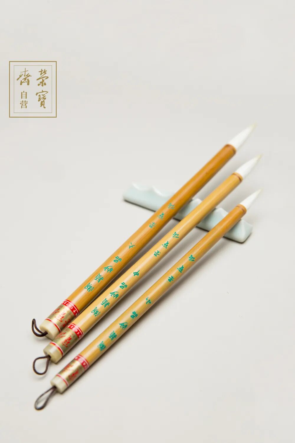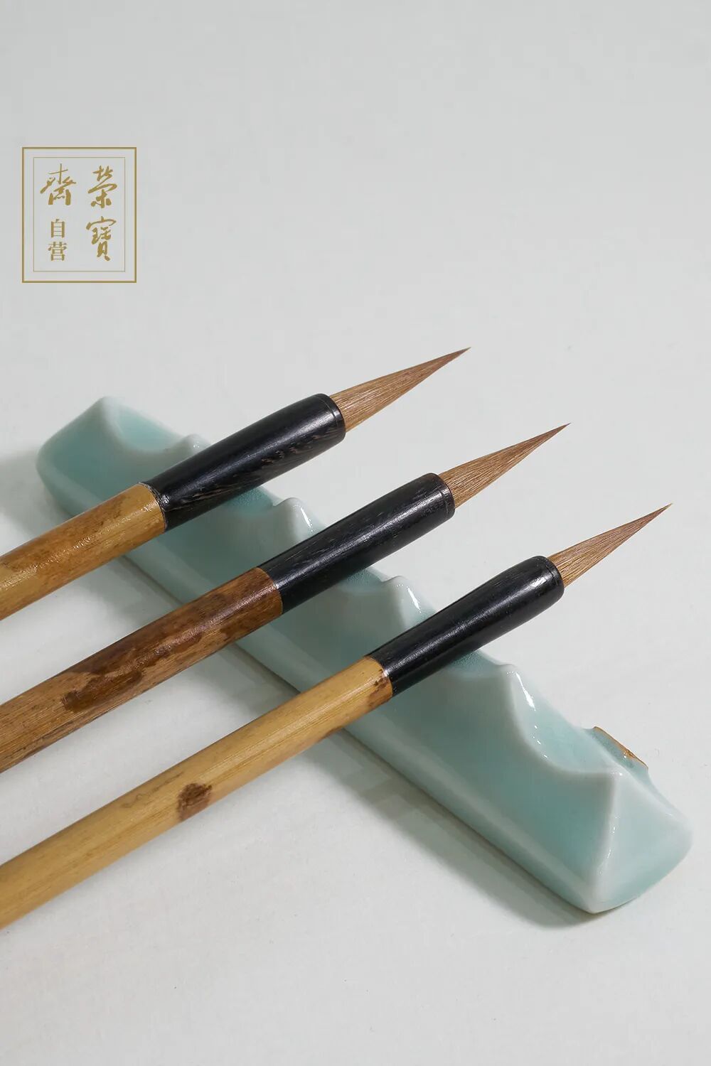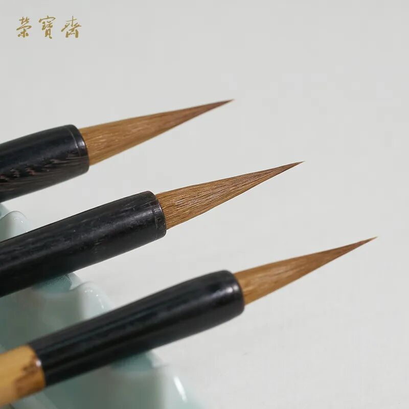 荣宝斋定制纯北尾狼毫小楷笔锋臻选纯龙江元尾制成,锋颖油亮,健而不硬。笔杆采用湘妃竹杆,质轻宜用。采用牛角制斗,提高了毛笔的耐用水平,同时也使造型更加俊美文雅。适用于小楷、行草,如文徵明、赵孟頫等书风。