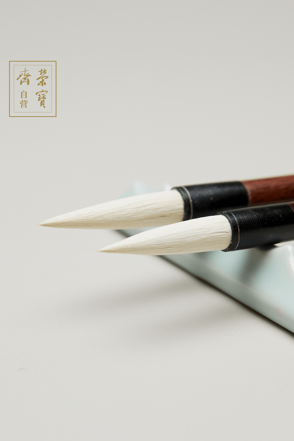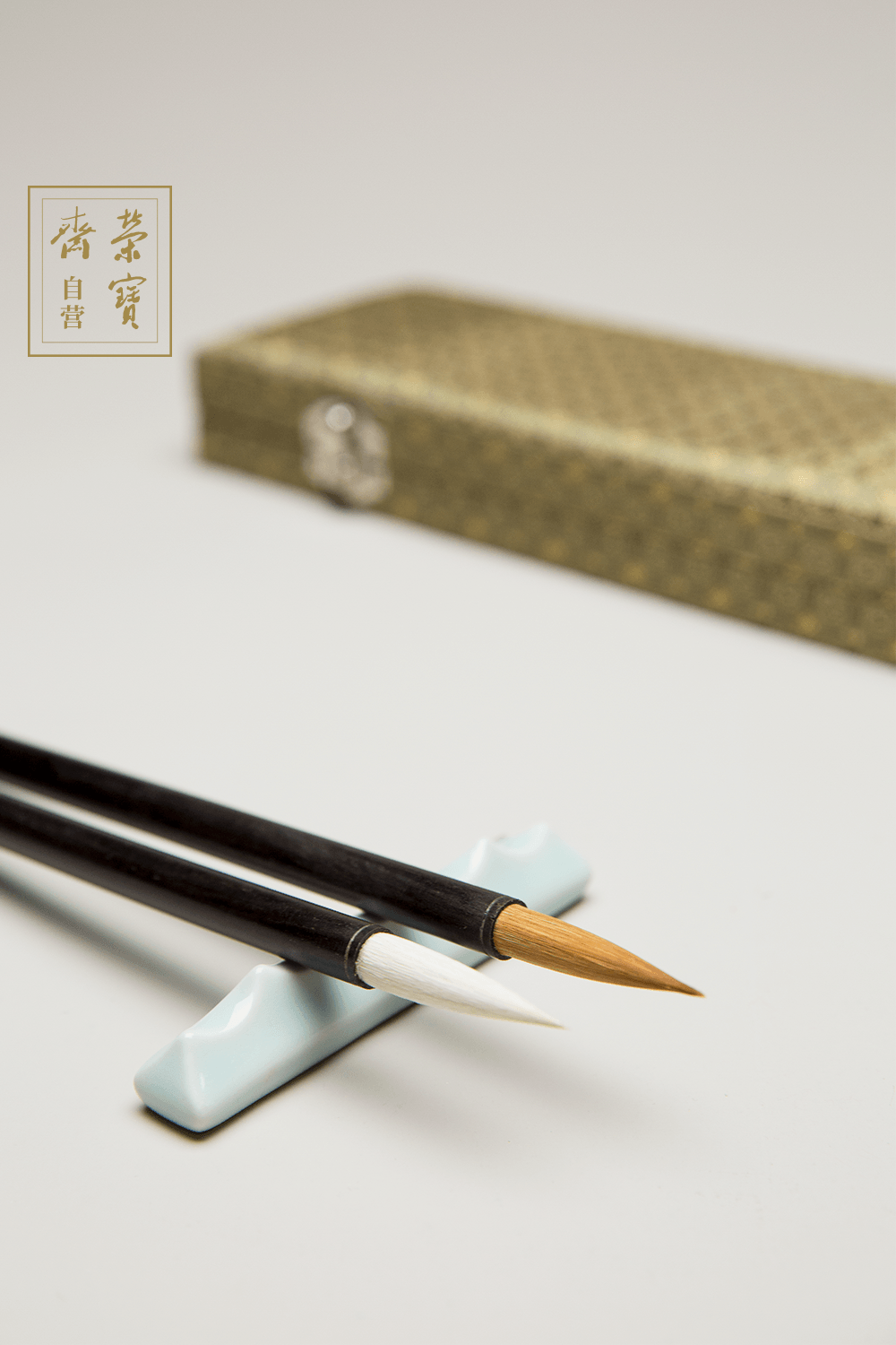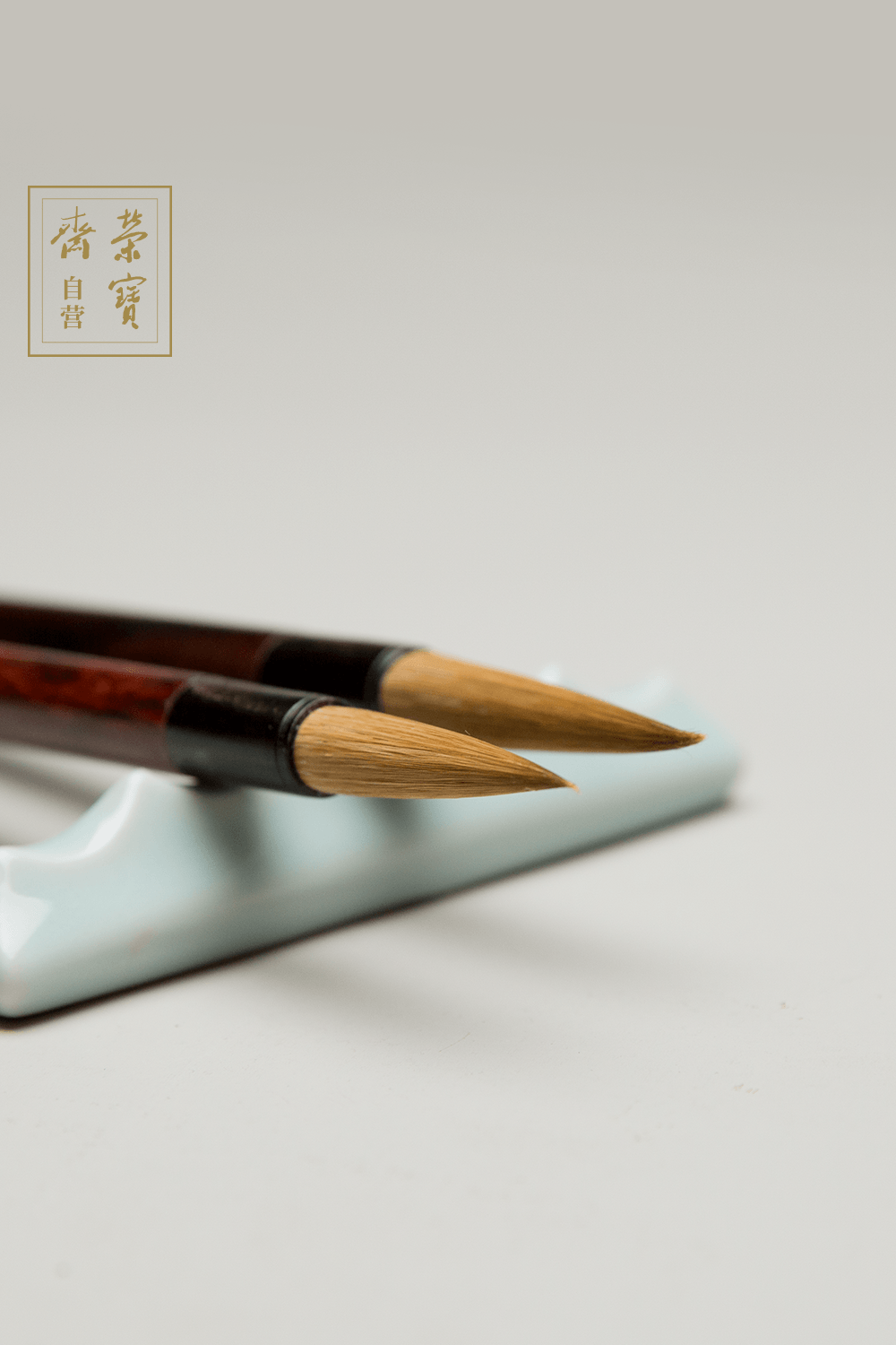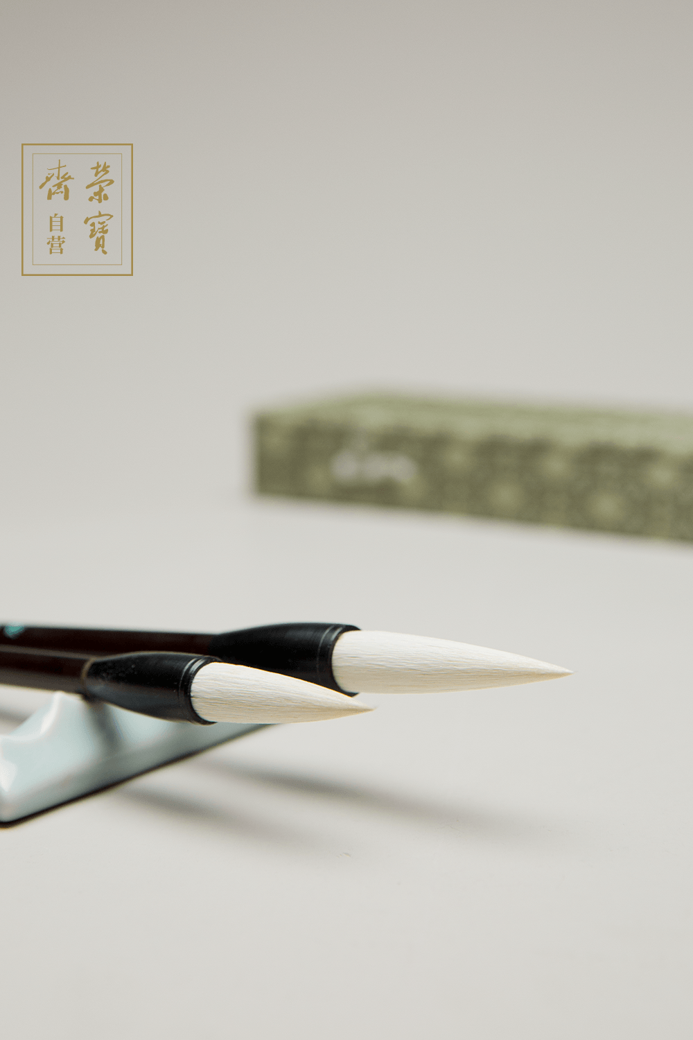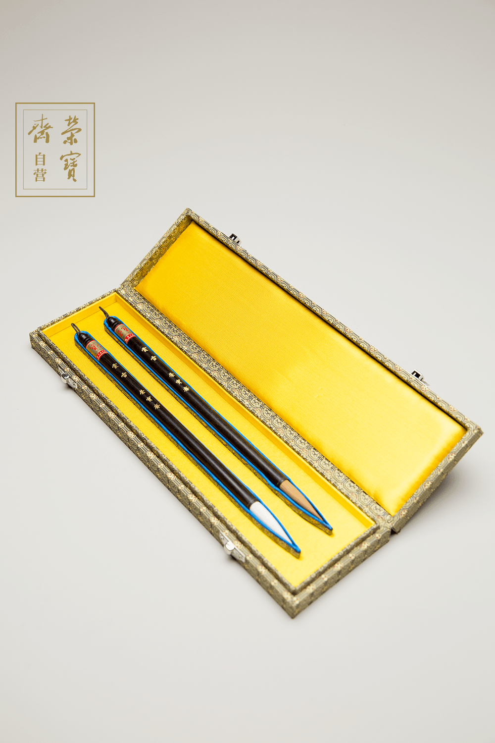 两支笔分别以狼毫、羊毫为主,配以多种辅毫制尖。狼毫挺健宜用,羊毫柔韧细腻,质量可靠,久经市场考验。红木笔杆刻字填青,笔斗及挂头镶嵌牛角,纯手工制作锦盒。