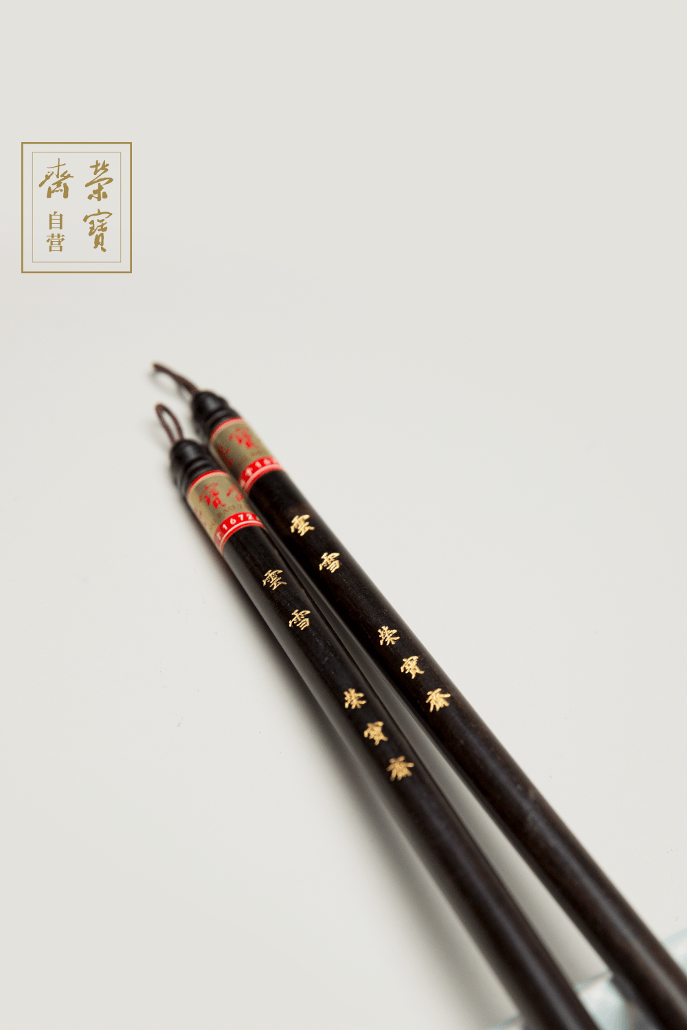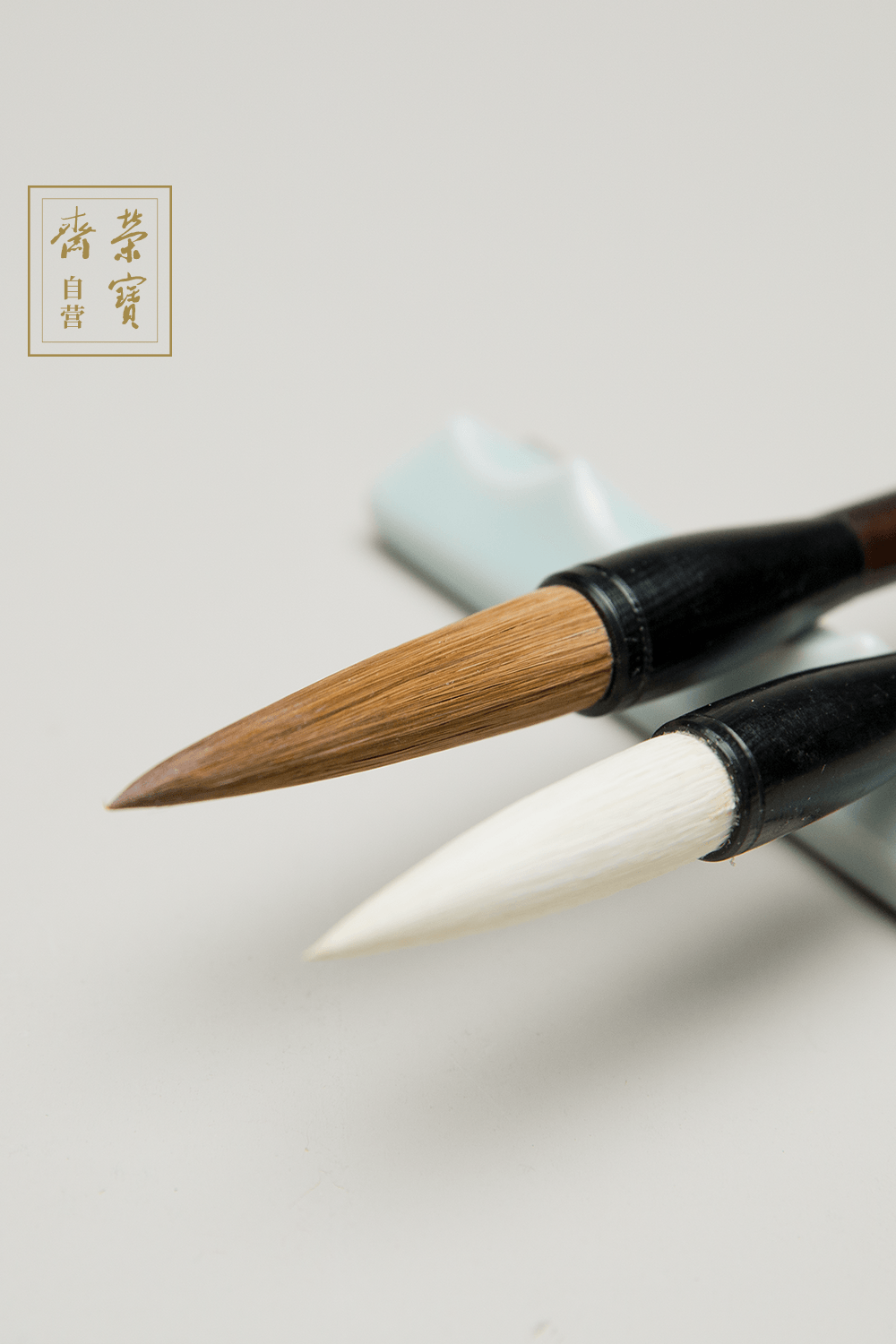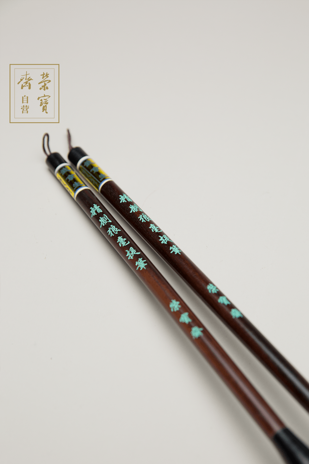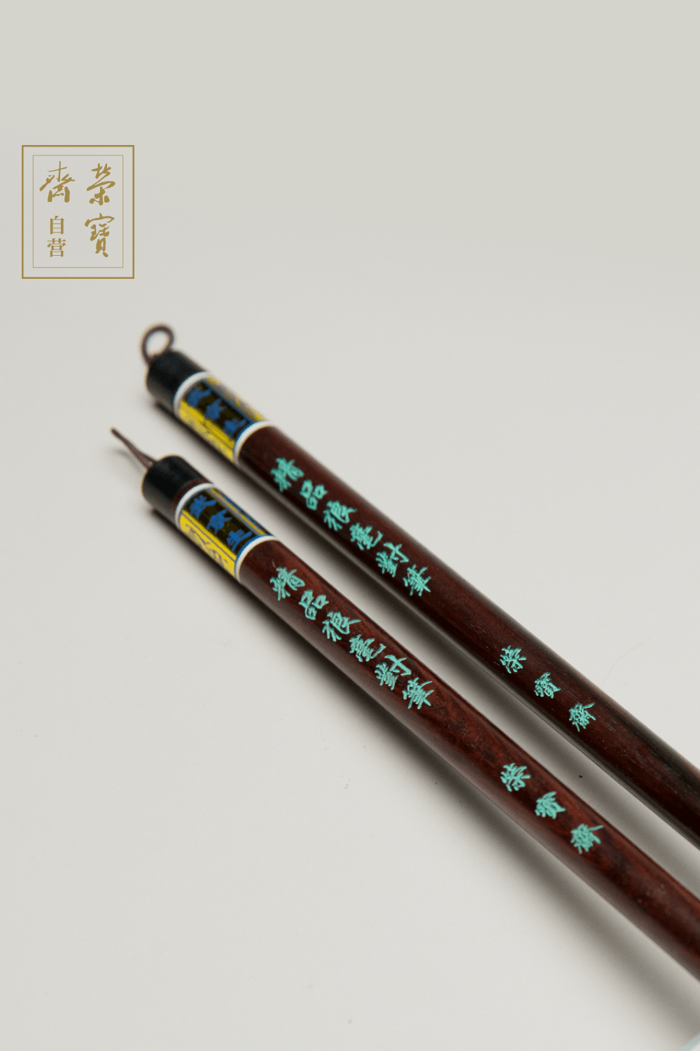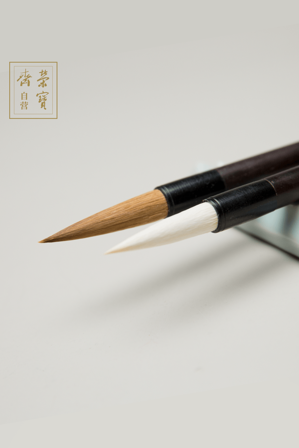 两支笔分别以狼毫、羊毫为主,配以多种辅毫制尖。狼毫挺健宜用,羊毫柔韧细腻,质量可靠,久经市场考验。红木笔杆刻字填青,笔斗及挂头镶嵌牛角,纯手工制作锦盒。