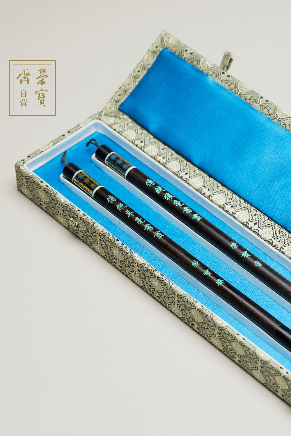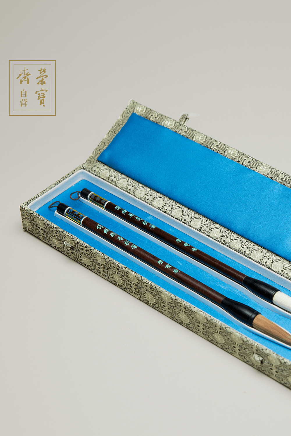 两支笔分别以狼毫、羊毫为主,配以多种辅毫制尖。狼毫挺健宜用,羊毫柔韧细腻,宜书宜画,广获好评。红木笔杆刻字填青,笔斗及挂头镶嵌牛角,纯手工制作锦盒。