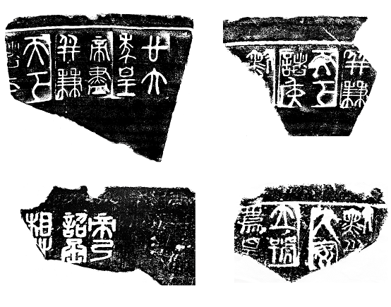 秦代陶文:主要是诏文,见于陶品质器上。秦代陶文可分为钤印和刻划两种。刻划陶文笔画劲健、挺拔;钤印的陶文一般字迹清晰、笔画均匀、结体端庄,边框整齐。已发现的秦代陶文布局多为秦陶量残片,如"廿六年皇帝尽并兼天下""并兼天下诸侯""黔首大安立号为皇""帝乃诏丞相"等,均为四字一组,未见单字,多有边框,从其 书法风格上来看,属秦代小篆,字体方正,笔画圆润,在笔法处理上不拘一格,富有明显变化,笔画较少的字刻制时笔画明显加粗,反之则笔画较细,这样整个章法和谐,具有强烈的艺术感染力。在秦代陶文中还发现"驺"字陶文,独立成字,小篆结体,字体遒劲圆润,具有圆润厚重、苍古端庄的韵味。右半"刍"字笔画略细,所占空间较小,左半"马"字笔画略粗壮,所占空间反而大,形成章法上险绝的效果。"驺"字陶文的发现印证了秦代设立"驺县"的史实,具有重要历史价值。