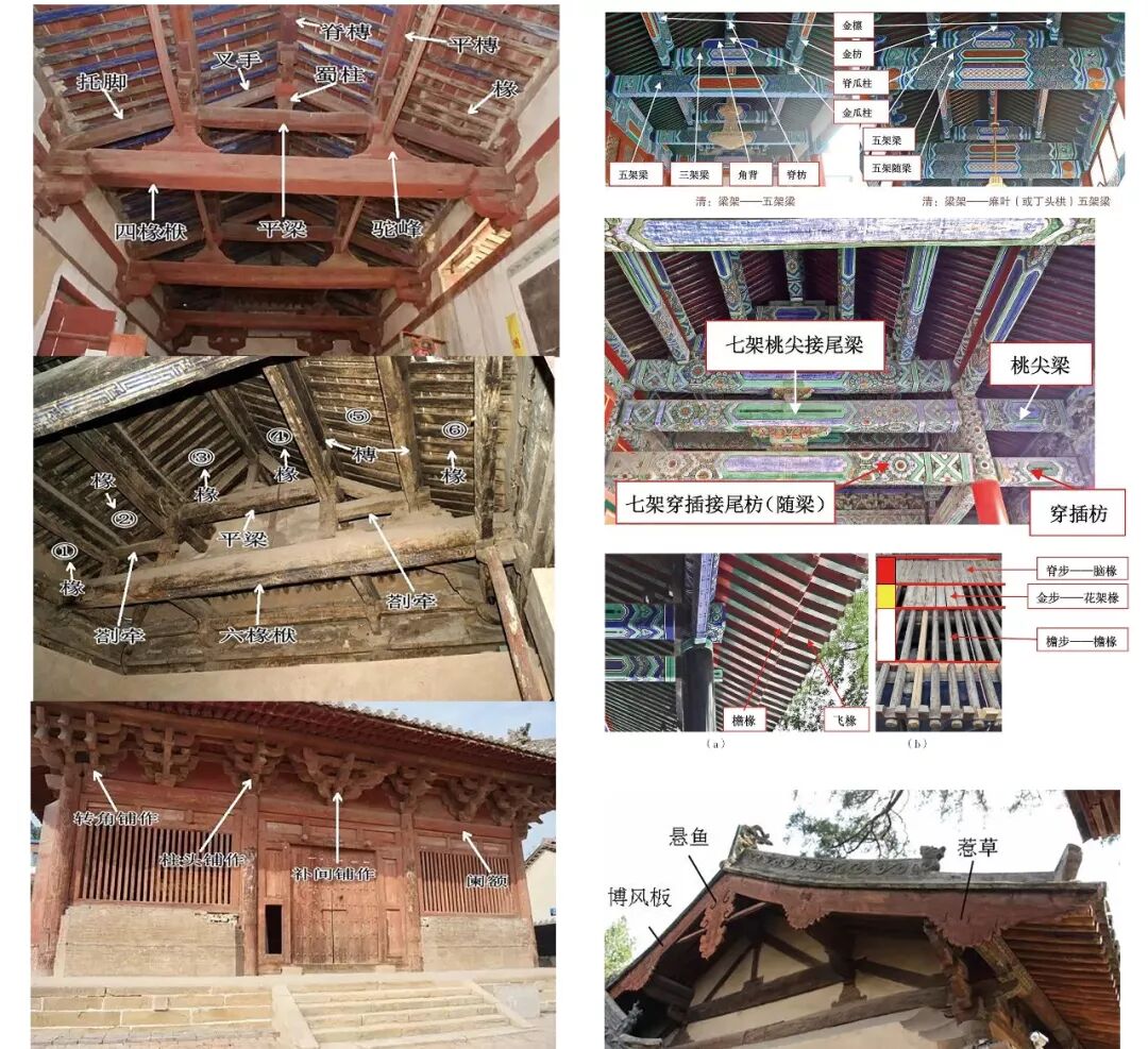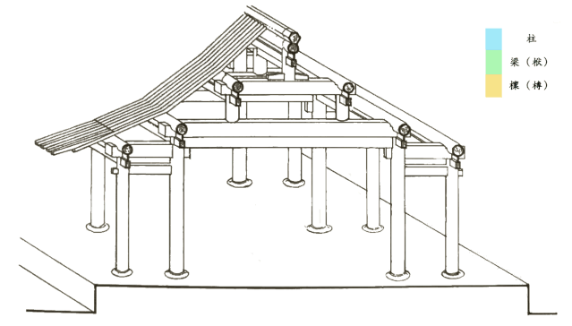 单从梁架做法上,中国传统建筑梁架形式分为三种:1.抬梁式;2.穿斗式;3.井干式。柱上架梁,梁上再立瓜柱,其上再施梁,如此叠加数层,每层梁逐步收短,最上层梁上立脊瓜柱,各层梁头和脊瓜柱上安置檁条。从而使荷载由檁到梁再到柱,逐层传递。