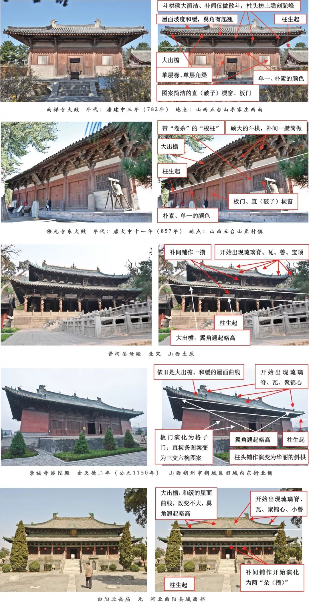 具体说,隋唐建筑,斗拱硕大,出檐深远,举折和缓,四翼舒展,屋顶整体感觉比较大气稳重,常用朱白两色彩画,朴素大方。宋代建筑,精致秀丽,彩画繁简得当,渐趋绚丽。辽金地处北方,对风格承袭唐代较多。元代又承袭金代,风格偏向于粗放不羁。