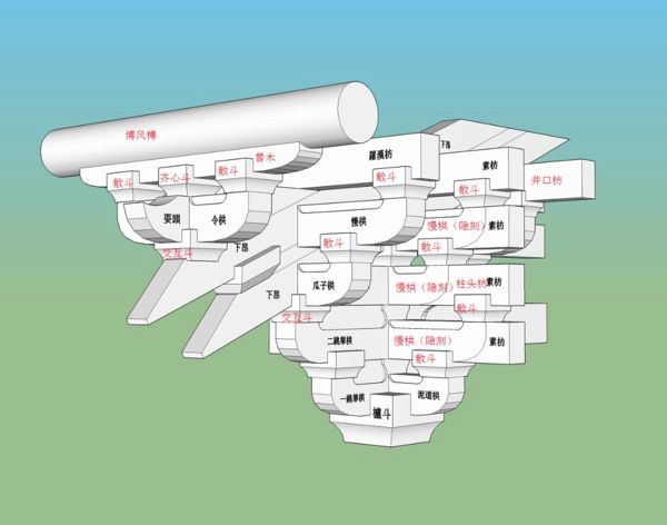 不仅有前后屋檐,两端还有与前后檐尺寸相同的檐。于是其两山部分便处于悬空状态。