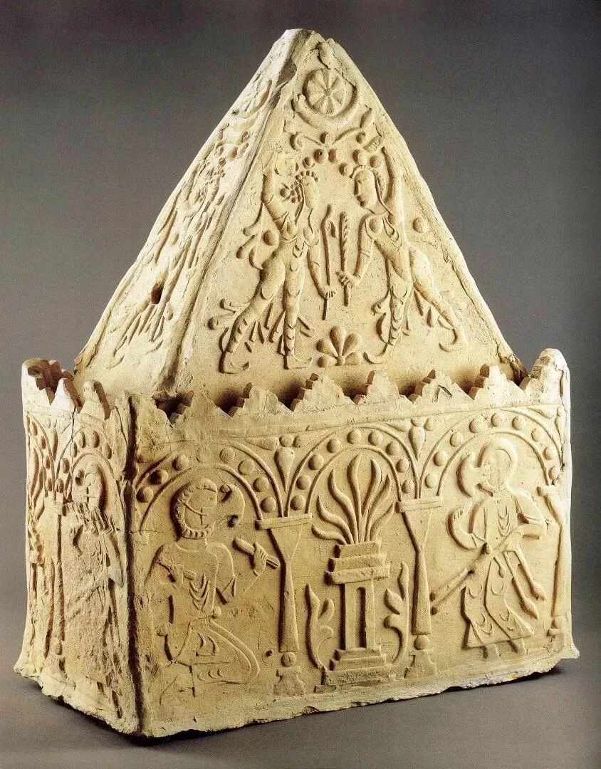 带金字塔型盖的骨灰盒。乌兹别克斯坦撒马尔罕以西(古代粟特),穆拉·库尔干(Mulla Kurgan),公元7世纪。焙烧粘土;高75 cm×宽52cm×深24cm。撒马尔罕阿夫拉西阿卜博物馆。