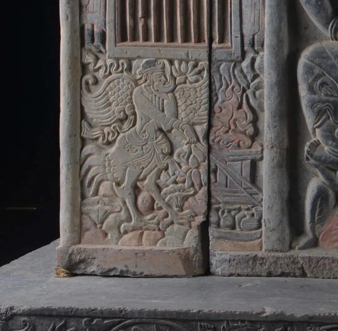 史君夫妇石棺外立面细节。守护圣火的羽人。西安,公元579 - 80年。