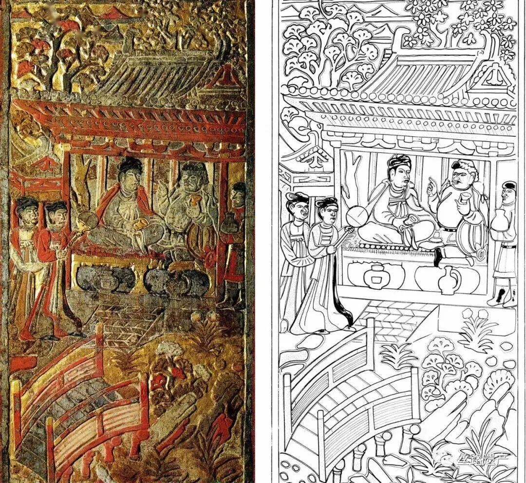 在北周皇帝的诏令下,按照中国土葬的方式,但是跟中国的土葬又不完全一样,他们利用整个石椁或者石屏的周边来画他们的生活和宗教场景。像这个守护神,特别是这个窗户底下是两个人面鸟身的神,正在摆弄着火坛。