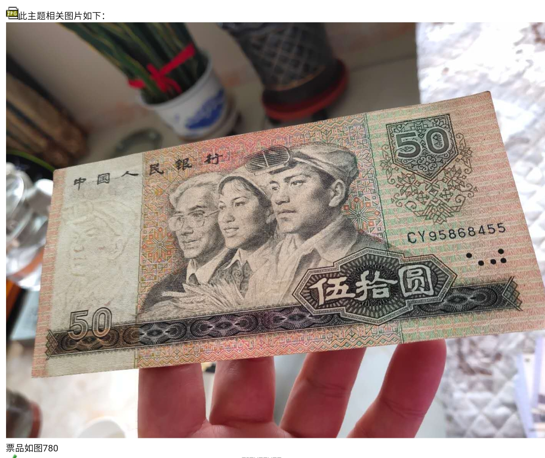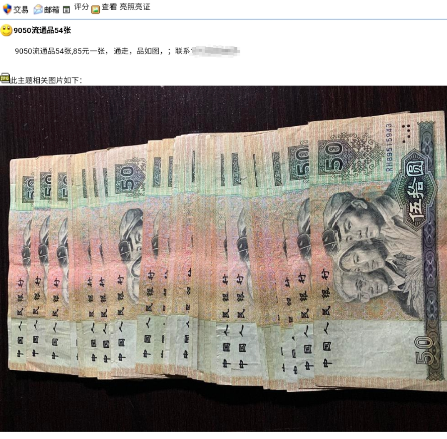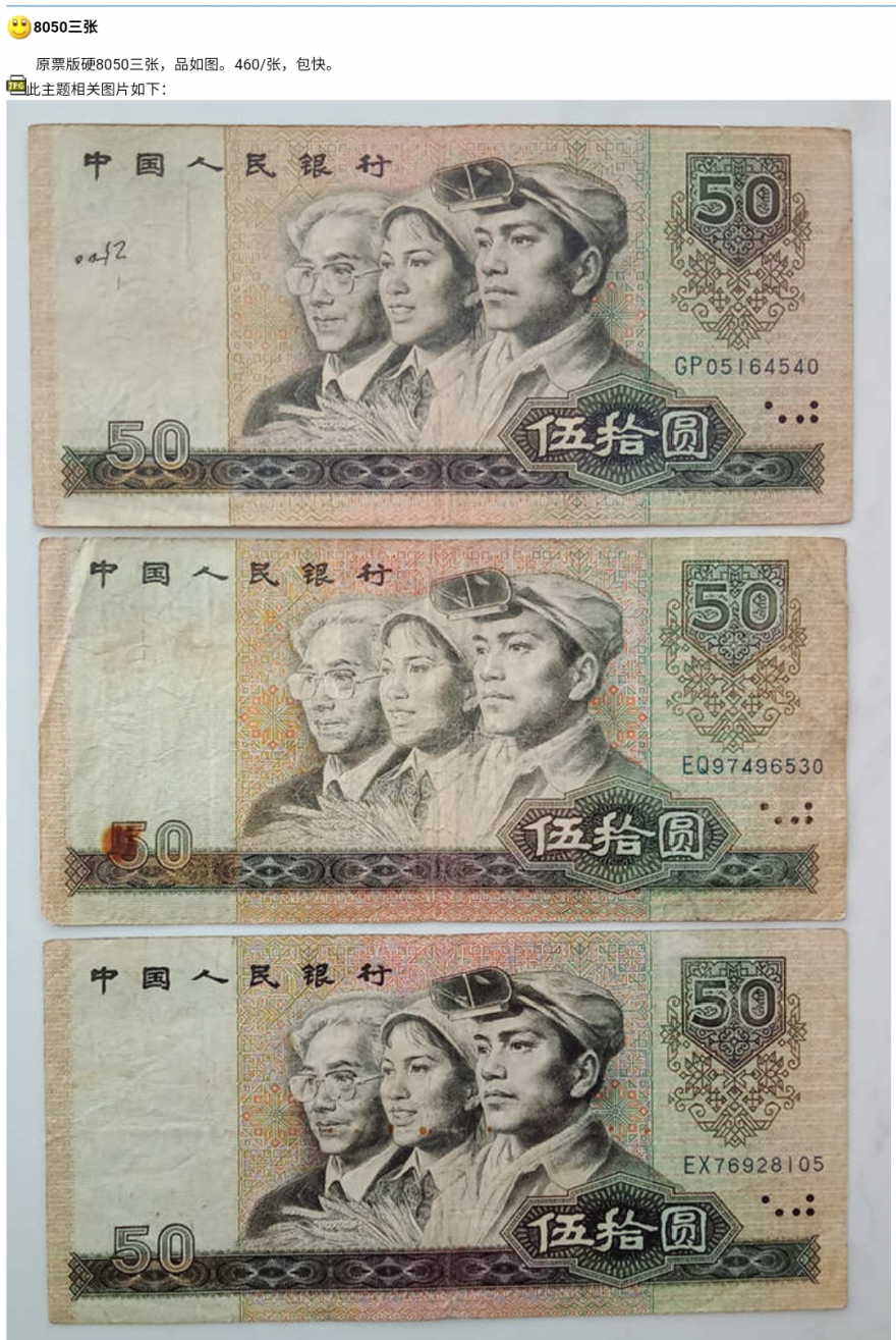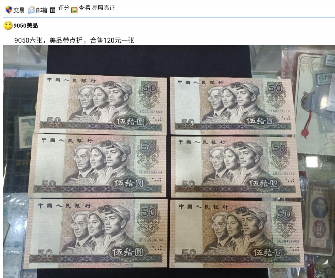 品相差一点的,像这种流通过的9050,四角磨圆、有明显的折痕、票面略微发黄,能卖85元一张。