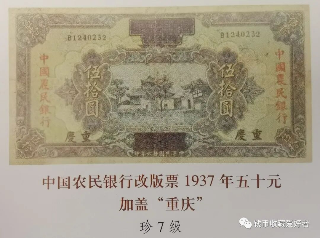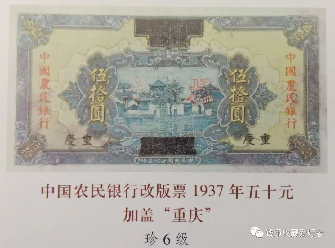 1937年、1940年印制一角、二角、一元、十元、二十元五种,后又增加五十元、一百元券两种。还发行了将广东省银行、湖北省银行、四川省银行、四川省政府建设库券改制成中国农民银行的改印券。