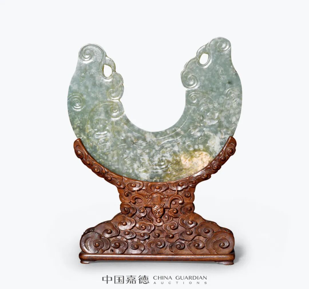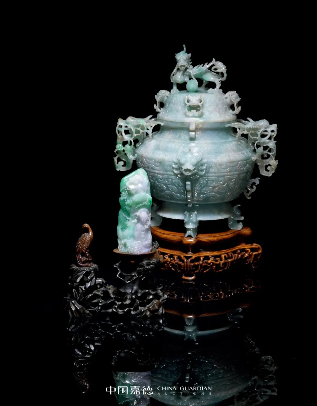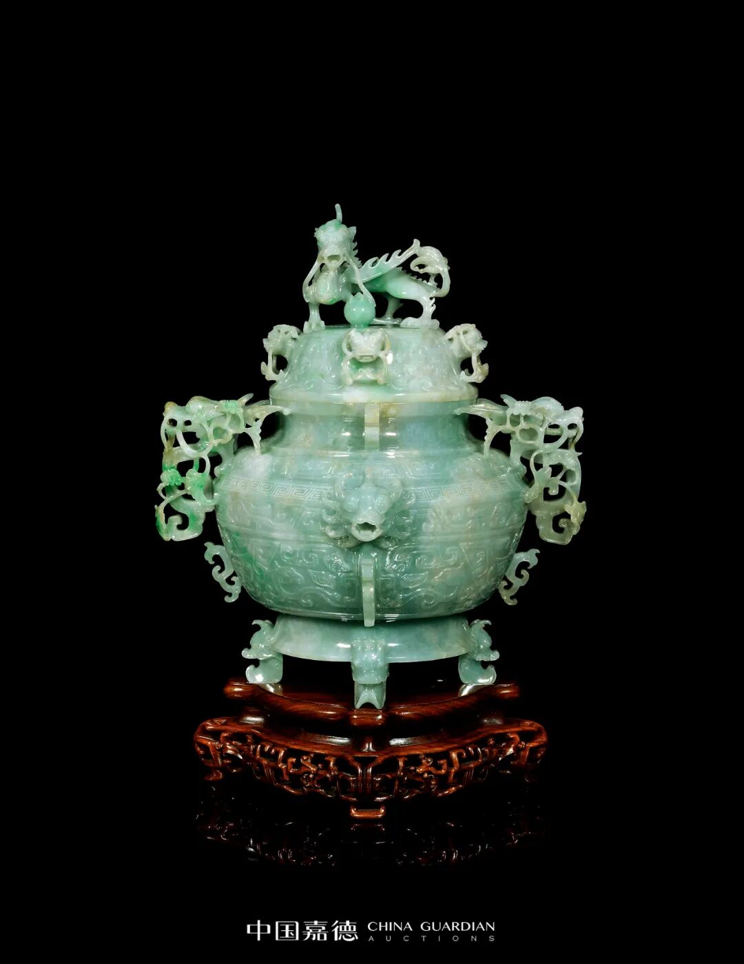 炉由盖和炉身两部分组成。盖隆起若台,顶部圆雕麒麟,须髯辄张,鳞爪飞扬,神态灵动,钮壁一周浅雕螭龙纹。盖壁雕一周简易螭龙纹,相间对称雕有四兽耳。盖炉子母口相扣。炉身盘口,口沿内挖一道,溜肩弧腹,近足外撇,颈部饰一周回纹,腹部浅雕饕餮纹,两侧面对称雕起双螭龙耳套环,另两面雕兽头并对应出戟。炉的造型及纹饰均为仿青铜器式样,古韵浓厚,应为陈设用器。此炉为翡翠质,整料圆雕而成,天然绿色隐隐泛蕴,抛光极好,各方衔接得体,浑若天成,平整细致光滑如镜的打磨技艺尽显美玉天姿,昭示出技艺的高超精湛。此块玉料体积较大,质量上乘,远观有宝光盈盈,近触则温润有加,如凝脂般莹洁通透,泛柔润之光泽。翡翠立体圆雕,玉质温润细腻,随形雕山下观音,林壑优美,蔚然深秀,峰回路转,有亭翼然。观音面相丰颐圆润,曲眉似弯月与鼻梁相连,眼睑较宽,神态慈和宁静,双眼微合,俯视前方,仿佛正在冥想之中,又似在出神聆听,寻觅众生求助的呼声,应声前去解救。观音菩萨具有寻声救苦、随类化现和协助阿弥陀佛接引众生往生西方极乐世界的当世和来世双重救助功用,历来深受人们的喜爱。翡翠颜色均匀鲜艳,质地细腻,荧光四射。观音衣襟线条飘逸流畅,刻画运刀如笔,山子构图如画,清新古雅,画面层次分明,线条清晰利落,雕琢技艺高超,工艺细致生动,刀法细劲遒婉,圆融的线条和柔美的造型最大限度地凸显了玉质的细腻和油润。屏风前郭子仪与夫人端坐,华服珠冠,四男子貌似弱冠,手捧贺礼,依次作揖贺寿,众男子着朝服,携儿带女,环立庭院,左右盼望,童子嬉戏打闹,儿女环绕。屏风后,珠帘后,女子探身,笑意吟吟。洞石周围,娇花嫩叶,竞相开放,披绿映红,五彩斑斓。郭子仪(697-781年),唐代武将,历经七朝,屡建军功,因功升中书令,后又进封汾阳王。郭子仪有七子八婿,都在朝做官,其第六子郭暧迎娶了升平公主,是唐代宗的驸马。他年至耄耋又官高位显,每逢其寿诞,子婿都到府祝寿。人们羡其尊官厚禄又子孙满堂,称颂为“大富贵亦寿考”。而“大富贵亦寿考”作为瓷器装饰,于有清一代颇为流行,表现出对于富贵长寿的美好愿景。本品造型、纹饰仍有晚明古拙风韵,釉面匀净,设色浓淡相宜,描绘精细,实为康熙青花五彩佳器。青绿柳条飘扬,骏马或立或奔或两两相啮或眠沙食草,神态各异,造型逼真,色彩外貌十分准确,栩栩如生,可谓极尽骏马之态,意趣盎然,近足处绘梅花纹。浅绛彩是清代晚期至民国早期在景德镇出现的崭新陶瓷装饰手法,咸丰三年(1853年)御窑厂停工后,直至同治五年(1866年)才复工,在此期间宫廷画师为谋生计,创新浅绛彩这一新品种。画师们不再受到帝制的约束,能够在瓷器上充分发挥自己绘画创造力,绘画题材上有个性化的表达,具有浓郁的中国文人画气息,这种艺术创造的自由氛围也孕育了一大批浅绛名家。本品整体画面色彩丰富,设色清丽淡雅,极具装饰效果,应出自名家之手。此式鹿头尊始见于乾隆时期,为清宫陈设观赏大器,道光、光绪时期持续烧造。本品沿用宫廷经典器型,配之以浅绛彩,既有皇家贵气,又不失文人画之雅致幽淡,值得珍视。著录 :《青磁を楽しむ》,爱知县陶磁资料馆,爱知中国古陶磁研究会,2004年,第73页,图66