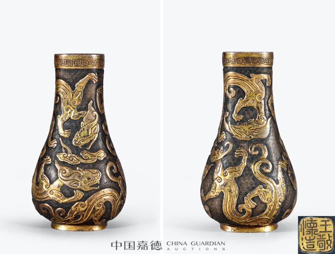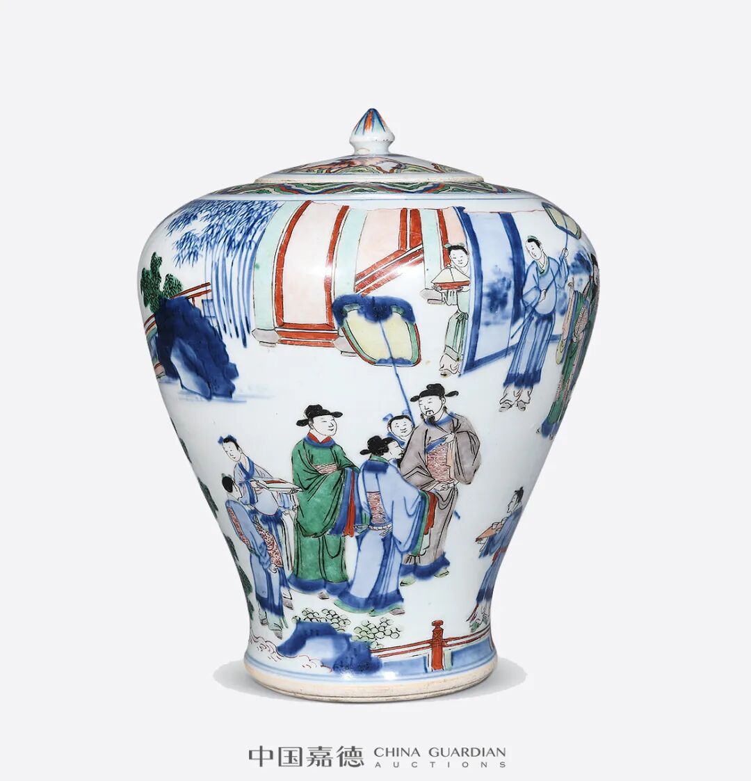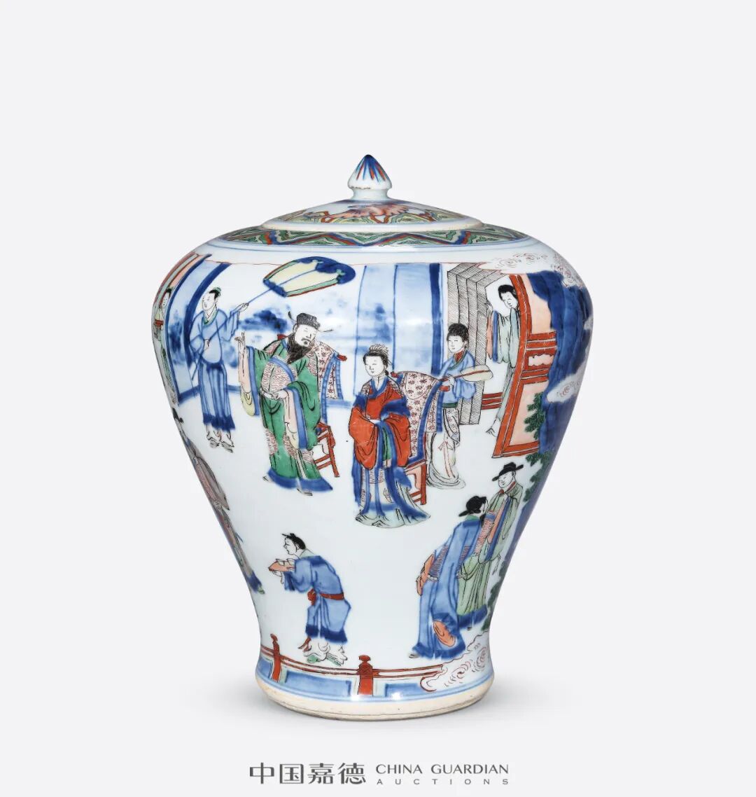 炉由盖和炉身两部分组成。盖隆起若台,顶部圆雕麒麟,须髯辄张,鳞爪飞扬,神态灵动,钮壁一周浅雕螭龙纹。盖壁雕一周简易螭龙纹,相间对称雕有四兽耳。盖炉子母口相扣。炉身盘口,口沿内挖一道,溜肩弧腹,近足外撇,颈部饰一周回纹,腹部浅雕饕餮纹,两侧面对称雕起双螭龙耳套环,另两面雕兽头并对应出戟。炉的造型及纹饰均为仿青铜器式样,古韵浓厚,应为陈设用器。此炉为翡翠质,整料圆雕而成,天然绿色隐隐泛蕴,抛光极好,各方衔接得体,浑若天成,平整细致光滑如镜的打磨技艺尽显美玉天姿,昭示出技艺的高超精湛。此块玉料体积较大,质量上乘,远观有宝光盈盈,近触则温润有加,如凝脂般莹洁通透,泛柔润之光泽。翡翠立体圆雕,玉质温润细腻,随形雕山下观音,林壑优美,蔚然深秀,峰回路转,有亭翼然。观音面相丰颐圆润,曲眉似弯月与鼻梁相连,眼睑较宽,神态慈和宁静,双眼微合,俯视前方,仿佛正在冥想之中,又似在出神聆听,寻觅众生求助的呼声,应声前去解救。观音菩萨具有寻声救苦、随类化现和协助阿弥陀佛接引众生往生西方极乐世界的当世和来世双重救助功用,历来深受人们的喜爱。翡翠颜色均匀鲜艳,质地细腻,荧光四射。观音衣襟线条飘逸流畅,刻画运刀如笔,山子构图如画,清新古雅,画面层次分明,线条清晰利落,雕琢技艺高超,工艺细致生动,刀法细劲遒婉,圆融的线条和柔美的造型最大限度地凸显了玉质的细腻和油润。屏风前郭子仪与夫人端坐,华服珠冠,四男子貌似弱冠,手捧贺礼,依次作揖贺寿,众男子着朝服,携儿带女,环立庭院,左右盼望,童子嬉戏打闹,儿女环绕。屏风后,珠帘后,女子探身,笑意吟吟。洞石周围,娇花嫩叶,竞相开放,披绿映红,五彩斑斓。郭子仪(697-781年),唐代武将,历经七朝,屡建军功,因功升中书令,后又进封汾阳王。郭子仪有七子八婿,都在朝做官,其第六子郭暧迎娶了升平公主,是唐代宗的驸马。他年至耄耋又官高位显,每逢其寿诞,子婿都到府祝寿。人们羡其尊官厚禄又子孙满堂,称颂为“大富贵亦寿考”。而“大富贵亦寿考”作为瓷器装饰,于有清一代颇为流行,表现出对于富贵长寿的美好愿景。本品造型、纹饰仍有晚明古拙风韵,釉面匀净,设色浓淡相宜,描绘精细,实为康熙青花五彩佳器。青绿柳条飘扬,骏马或立或奔或两两相啮或眠沙食草,神态各异,造型逼真,色彩外貌十分准确,栩栩如生,可谓极尽骏马之态,意趣盎然,近足处绘梅花纹。浅绛彩是清代晚期至民国早期在景德镇出现的崭新陶瓷装饰手法,咸丰三年(1853年)御窑厂停工后,直至同治五年(1866年)才复工,在此期间宫廷画师为谋生计,创新浅绛彩这一新品种。画师们不再受到帝制的约束,能够在瓷器上充分发挥自己绘画创造力,绘画题材上有个性化的表达,具有浓郁的中国文人画气息,这种艺术创造的自由氛围也孕育了一大批浅绛名家。本品整体画面色彩丰富,设色清丽淡雅,极具装饰效果,应出自名家之手。此式鹿头尊始见于乾隆时期,为清宫陈设观赏大器,道光、光绪时期持续烧造。本品沿用宫廷经典器型,配之以浅绛彩,既有皇家贵气,又不失文人画之雅致幽淡,值得珍视。著录 :《青磁を楽しむ》,爱知县陶磁资料馆,爱知中国古陶磁研究会,2004年,第73页,图66