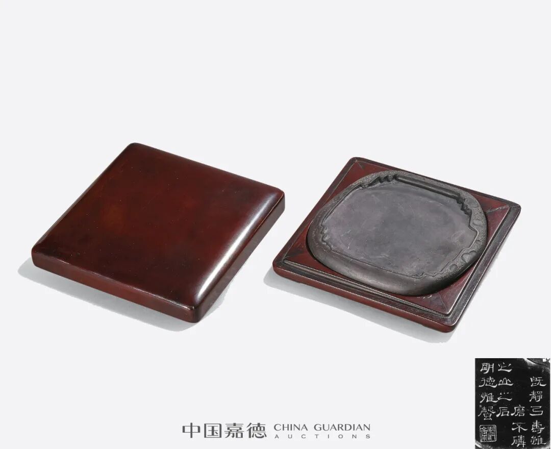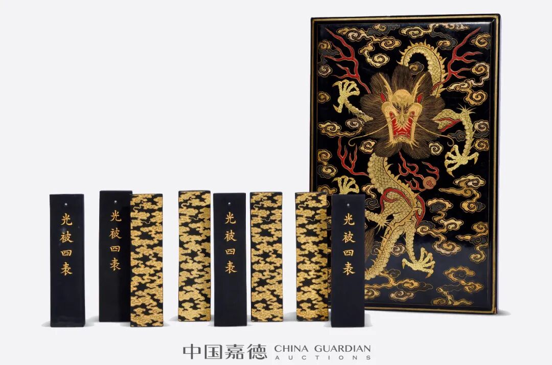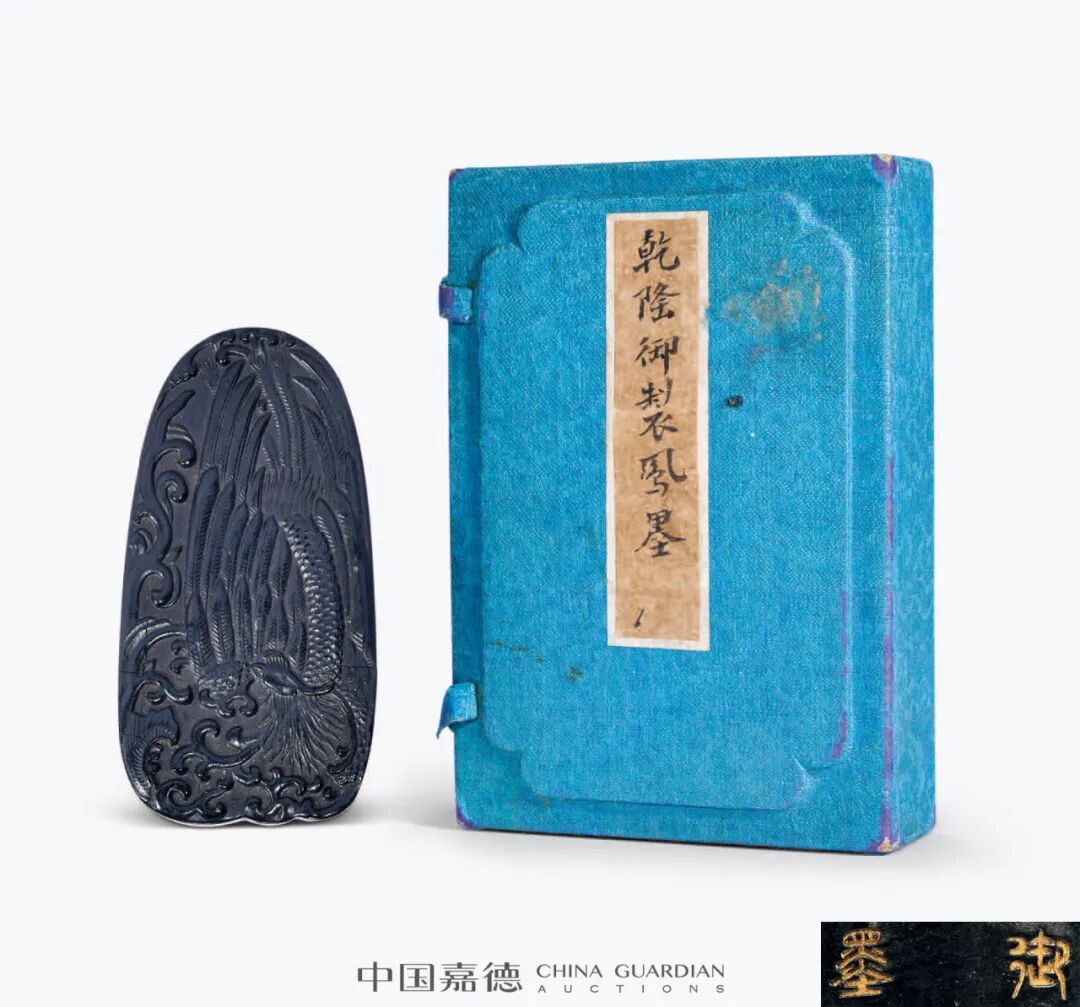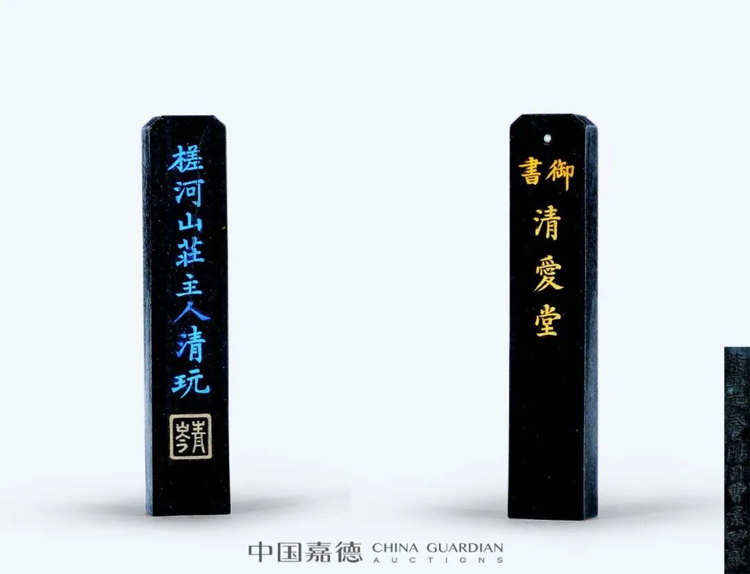 著录:《古砚》,第七卷,东京精华堂,1970年,图二十九此式墨为乾隆时期内府所制御墨,造型如斯顶窄趾宽者,乾隆时期可见几款,设计或为手持研磨之便。乾隆御墨另有一品名曰“来仪”,亦是通体漆衣,以凤凰为饰,中心内凹,一面书“来仪”,另一面书“御墨”,设计理念与本品相类。安徽省博物馆藏有与本品相类者,可资比较。清康熙五十二年(1713年) 曹素功制御书清爱堂墨正铭文“御书清爱堂”、背铭文“槎河山庄主人清玩”、钤印“青岑”、 边“紫玉光、癸巳(1713年)阳月曹素功制”款、带旧包装本品为曹素功为刘墉祖父刘棨所制之墨。“清爱堂”为康熙皇帝为刘棨所题堂匾。