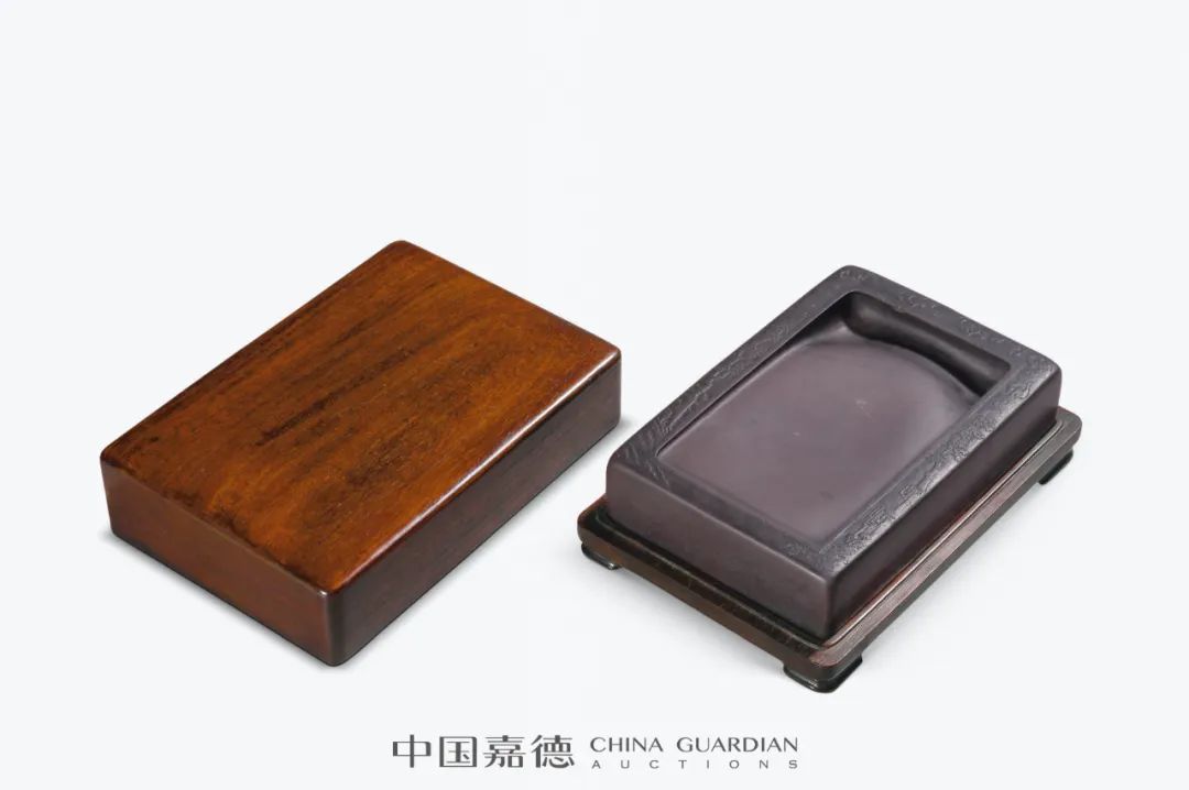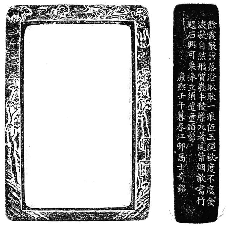 清康熙四十一年(1702年)高士奇款老坑端石福禄纹淌池砚边铭文“余霞散,碧落澄。耿耿一痕低玉绳,欲度不度金波凝。自然形质发丰稜,麋丸著处紫烟歕。书竹题石兴可乘,捧立须遣童头鬅。康熙壬午(1702年)暮春,江村高士奇铭”、带盒、带日本包装展览:《文房清供展》,福冈市美术馆,1982年11月9日-11月14日,第165号著录:《文房清供展》,福冈县高等学校书道教育研究部会,1982年,第52页,图165